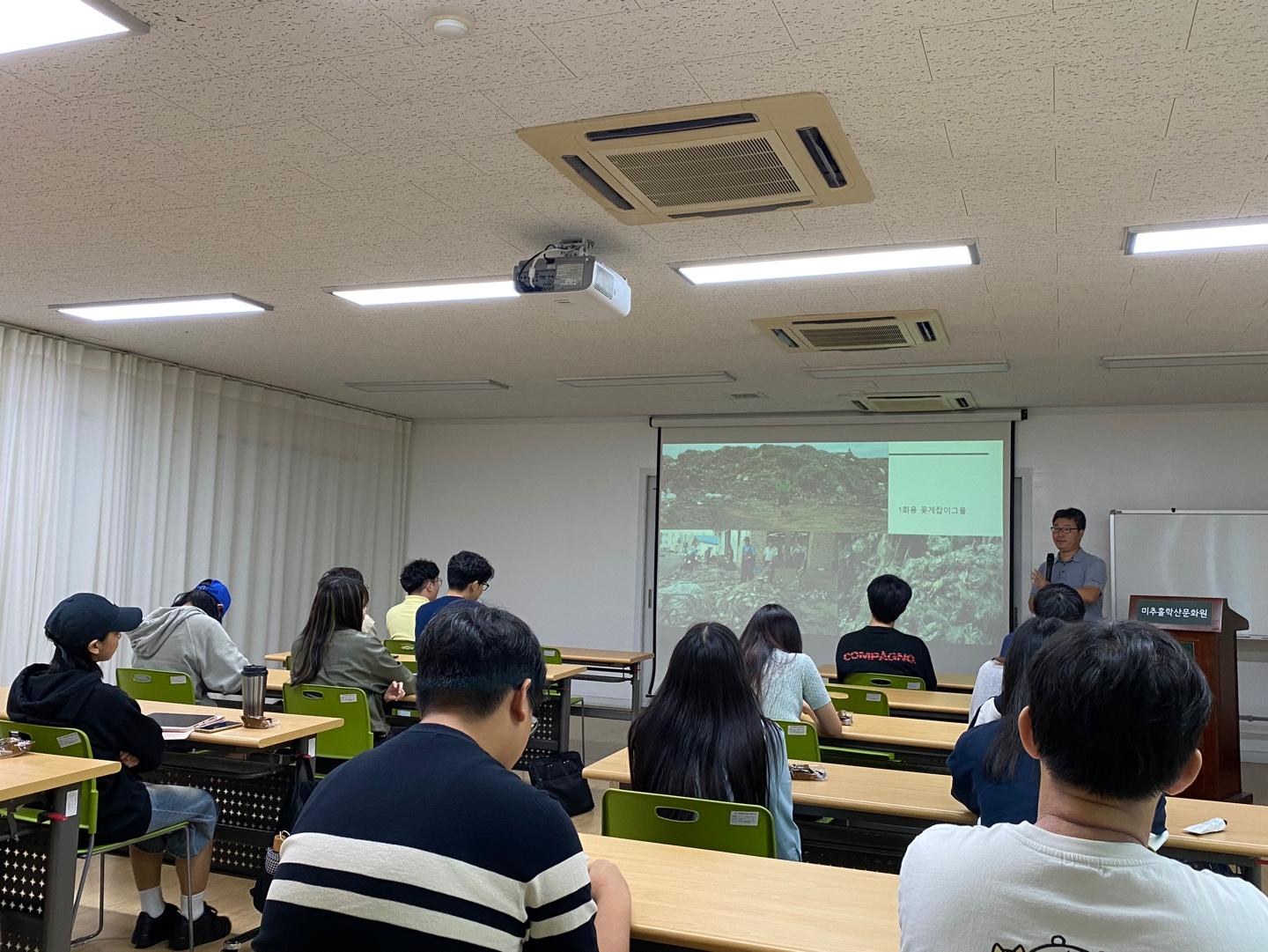 미추홀학산문화원이 인하대학교 프런티어 학부과 협약을 통해 2023년 2학기 '세계시민성교육'강좌의 일부 과정을 공동기획, 운영하였다. 사진은 강좌의 2차시 세계 시민성과 로컬사례의 일환으로 진행된 [한반도와 황해 그리고 인천_해양환경을 중심으로]의 현장사진이다. 강의는 장정구 (사)생태교육센터 이랑 공동대표가 맡았다.