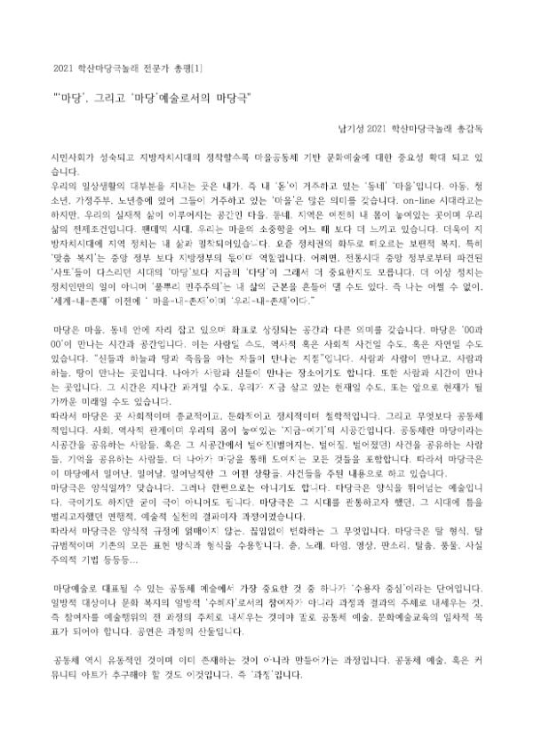 * 참여 전문가 : 남기성 2021 학산마당극놀래 총감독