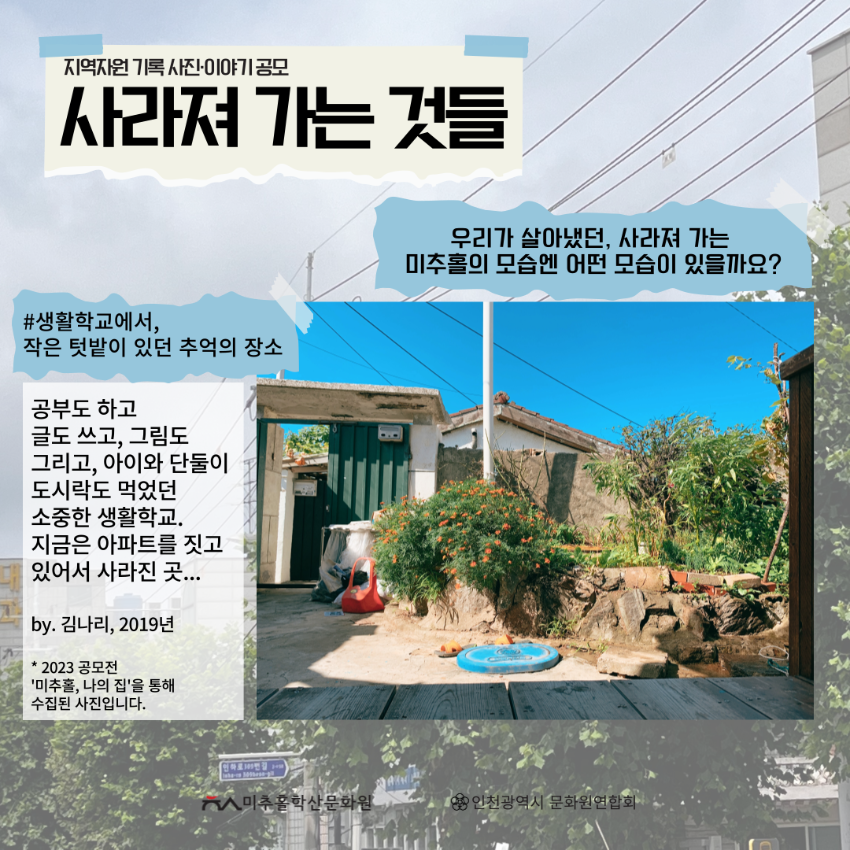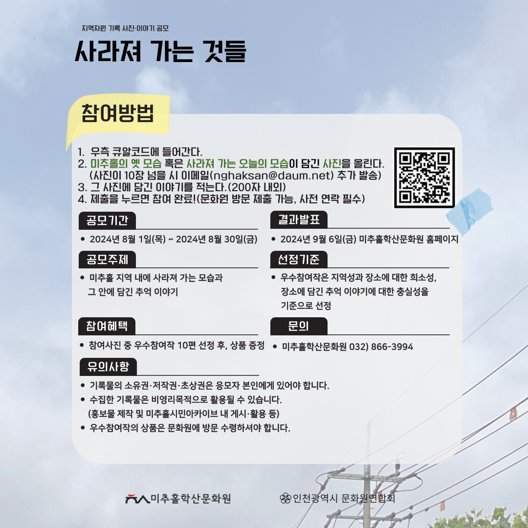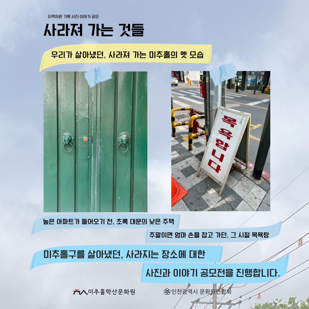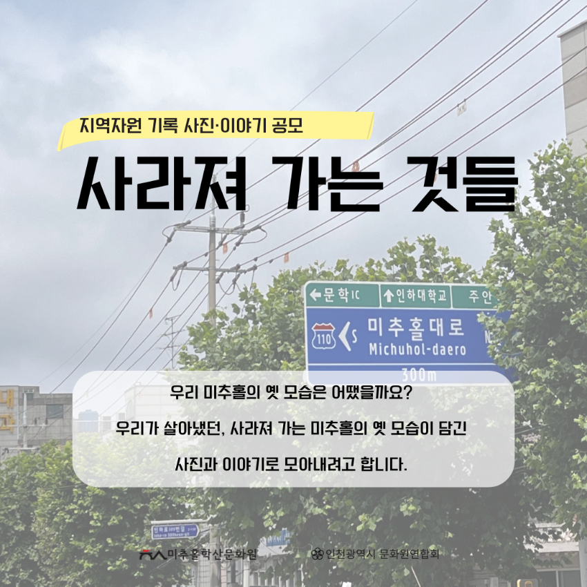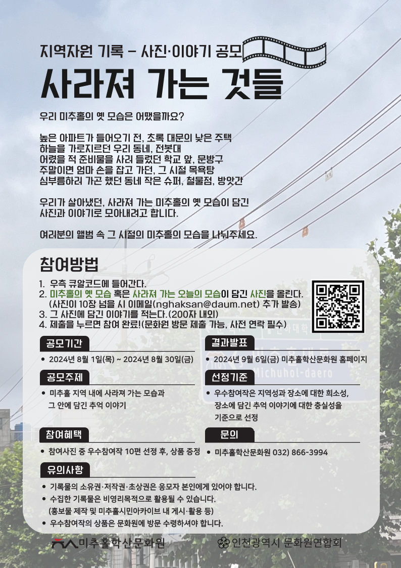 미추홀학산문화원은 2024 특성화사업 기록물 수집 공모전의 일환으로 미추홀의 사라져 가는 풍경과 추억을 기록하기 위하여 사진과 이야기 수집 공모전을 개최하였다.