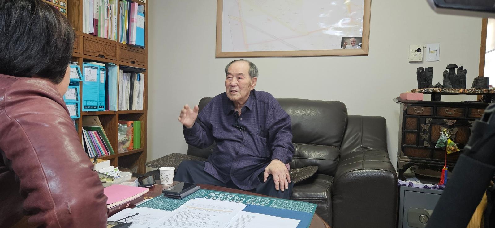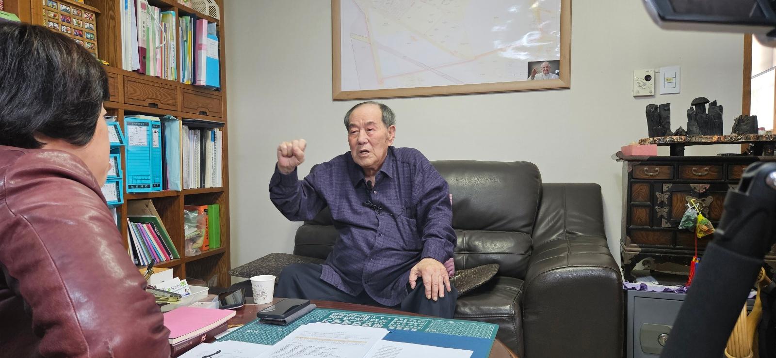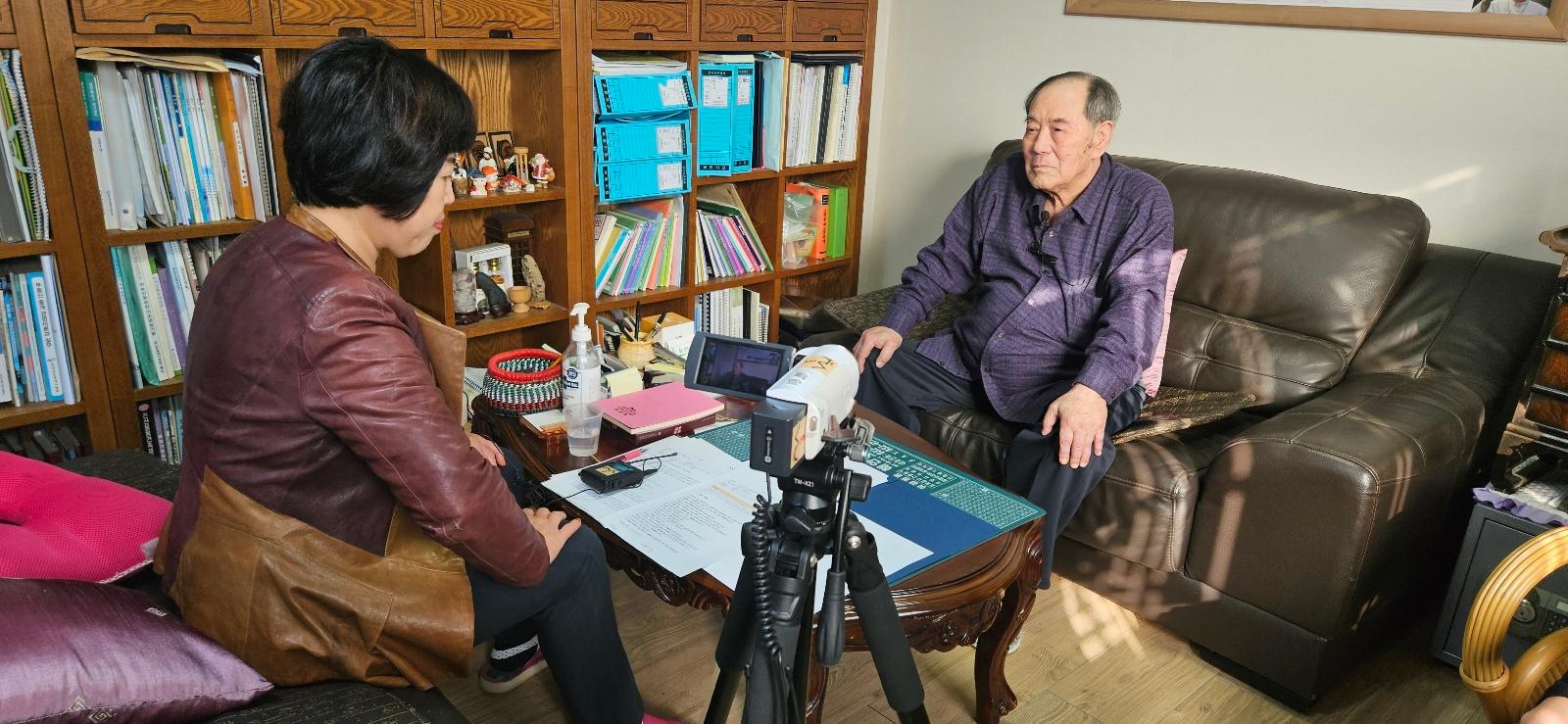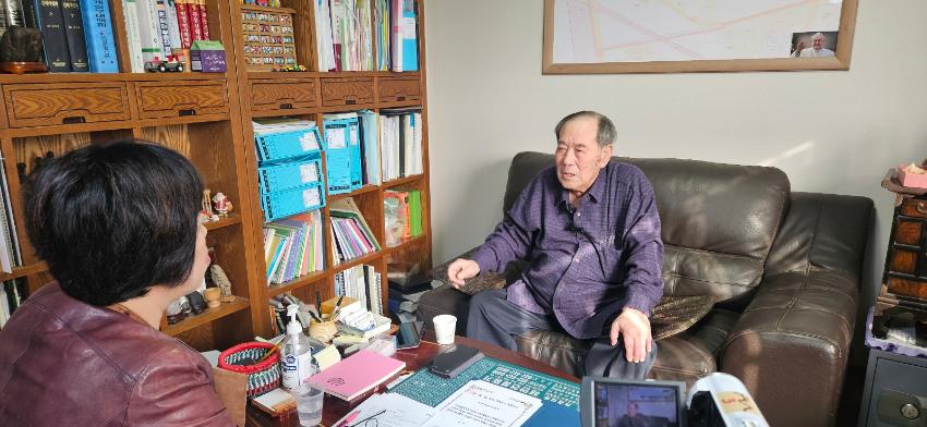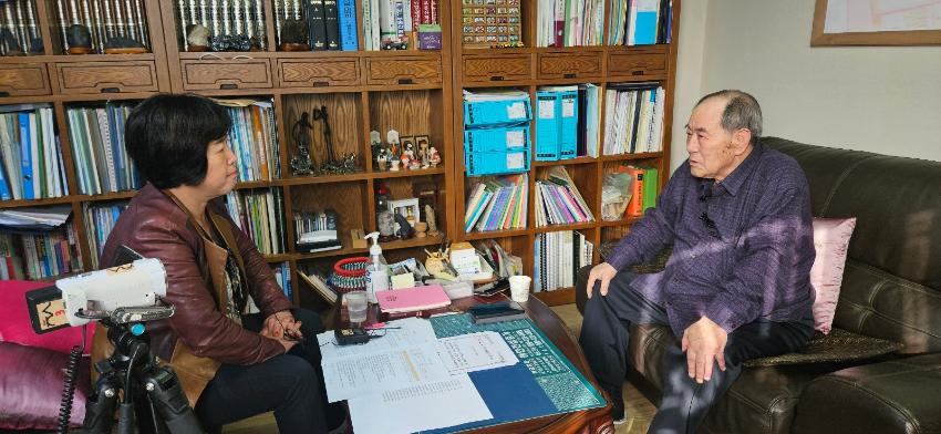 2024년 11월 13일 미추홀구에서 최초의 쫄면을 개발하게된 동기와 정돈시 구술자의 생애사에 대하여 구술채록 인터뷰를 하는 모습이다.