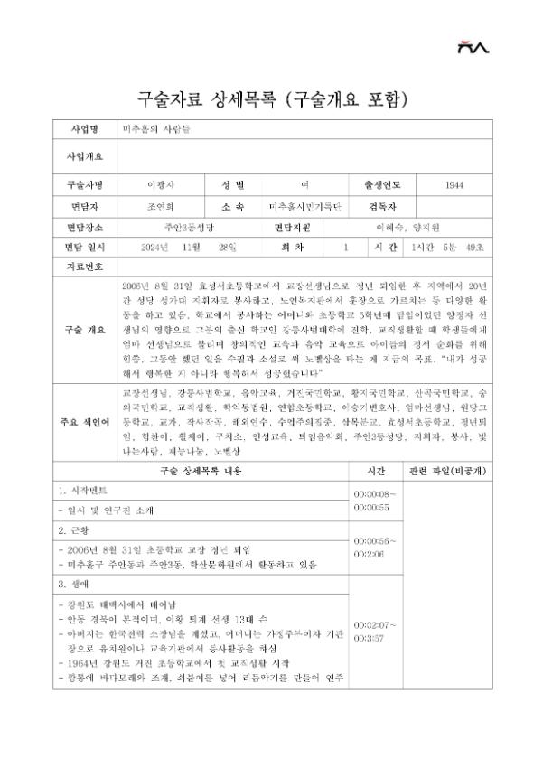 | 출처분류 | 미추홀학산문화원 사업 미추홀 기록 2024 미추홀시민기록단 구술기록 이광자 |