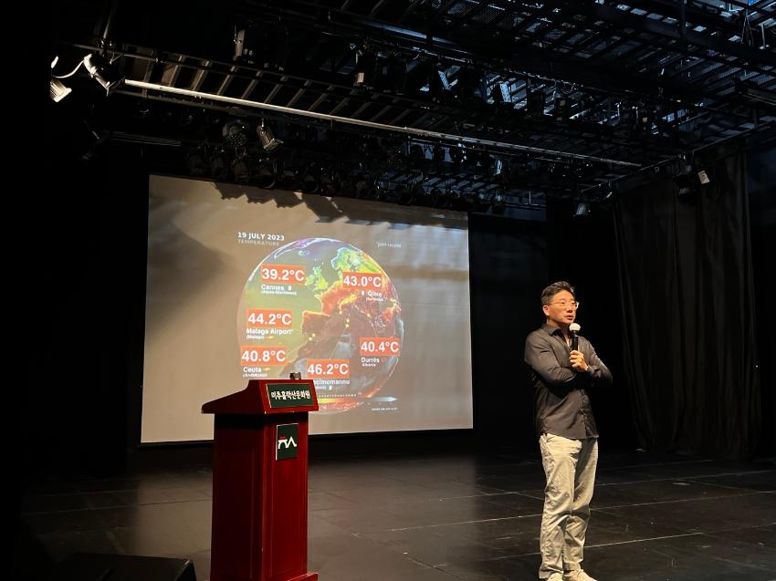 1강 [지금, 지구에서 '세계시민'이 된다는 것]의 현장 사진으로, 이원재 문화연대 상임위원장이 강의를 진행했습니다.
