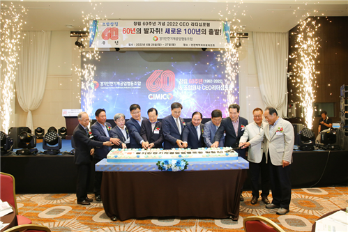 경기 연천군 백학자유로리조트에서 열린 경기인천기계공업협동조합 창립60주년 기념식에서 임직원들과 내빈들이 함께 축하 케이크를 커팅하고 있다.