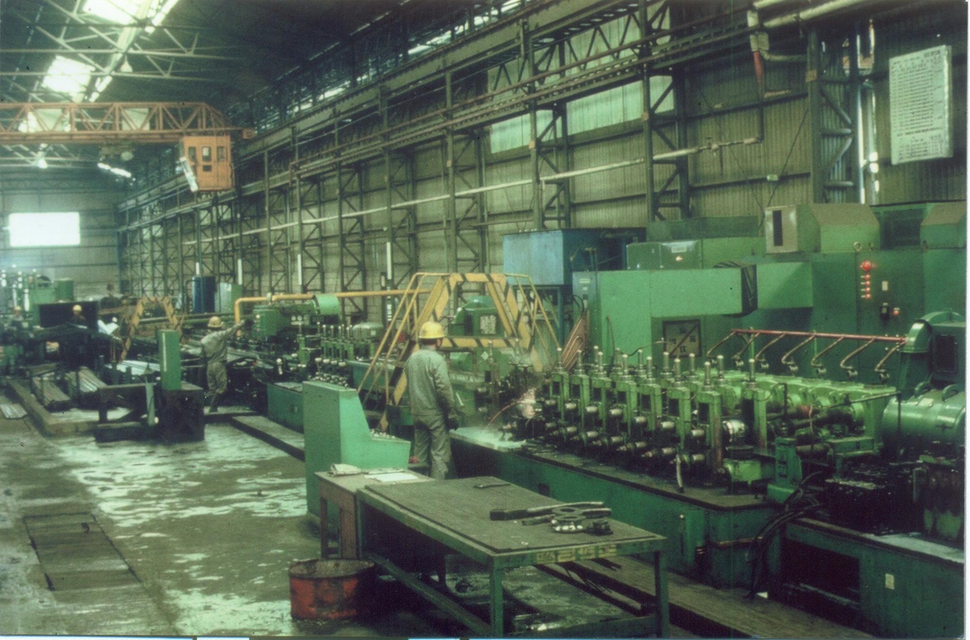파이프가 만들어지는 공장 내부 사진 파이프는 말려진 철 원대강을 파이프의 외경, 원주길이만큼 풀면서 잘라서, 감는 것이다. 그 것을 이 기계에 집어 넣으면 말아주는 것이다. 한줄로 말려서 센터로 오면 그 부분을 용접하는 것이다. 속도가 빨라서 분당 100m씩 나간다.