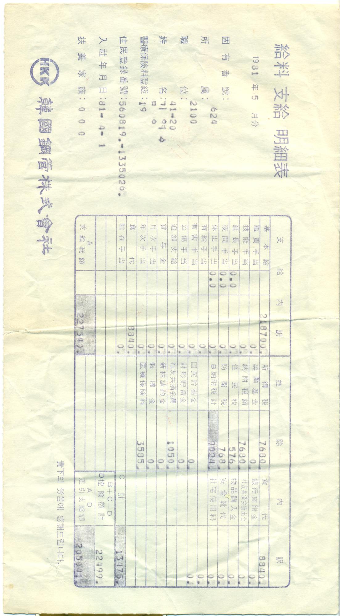 한국강관 월급봉투