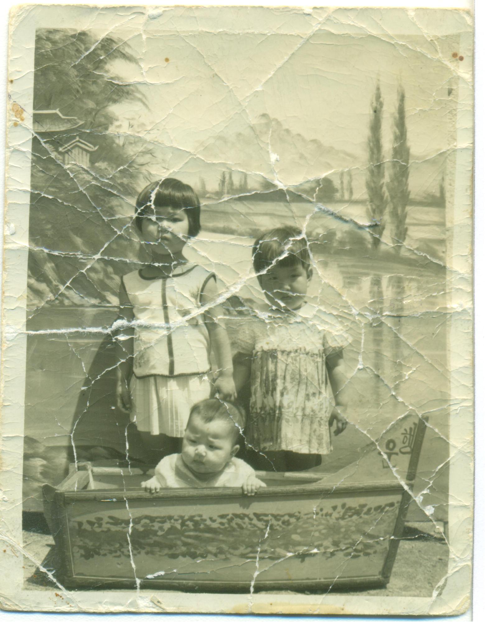 1973년에 집 앞에서 찍은 사진 (왼쪽 위부터 시계방향으로 첫째 언니 최은주, 셋째 언니 최은숙, 구술자 본인, 둘째 언니는 당시에 시골에 보내졌음. 사진을 찍을 당시 동네를 돌아다니면서 사진을 찍어주는 사진사가 있었고, 뒷배경과 배 모양 가구는 사진사가 가지고 다니던 도구였다고 함.)