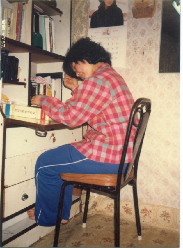 용현 5동 606번지 자택 작은방에서 첫째 언니(최은주)가 책상에 앉아 공부하고 있는 사진