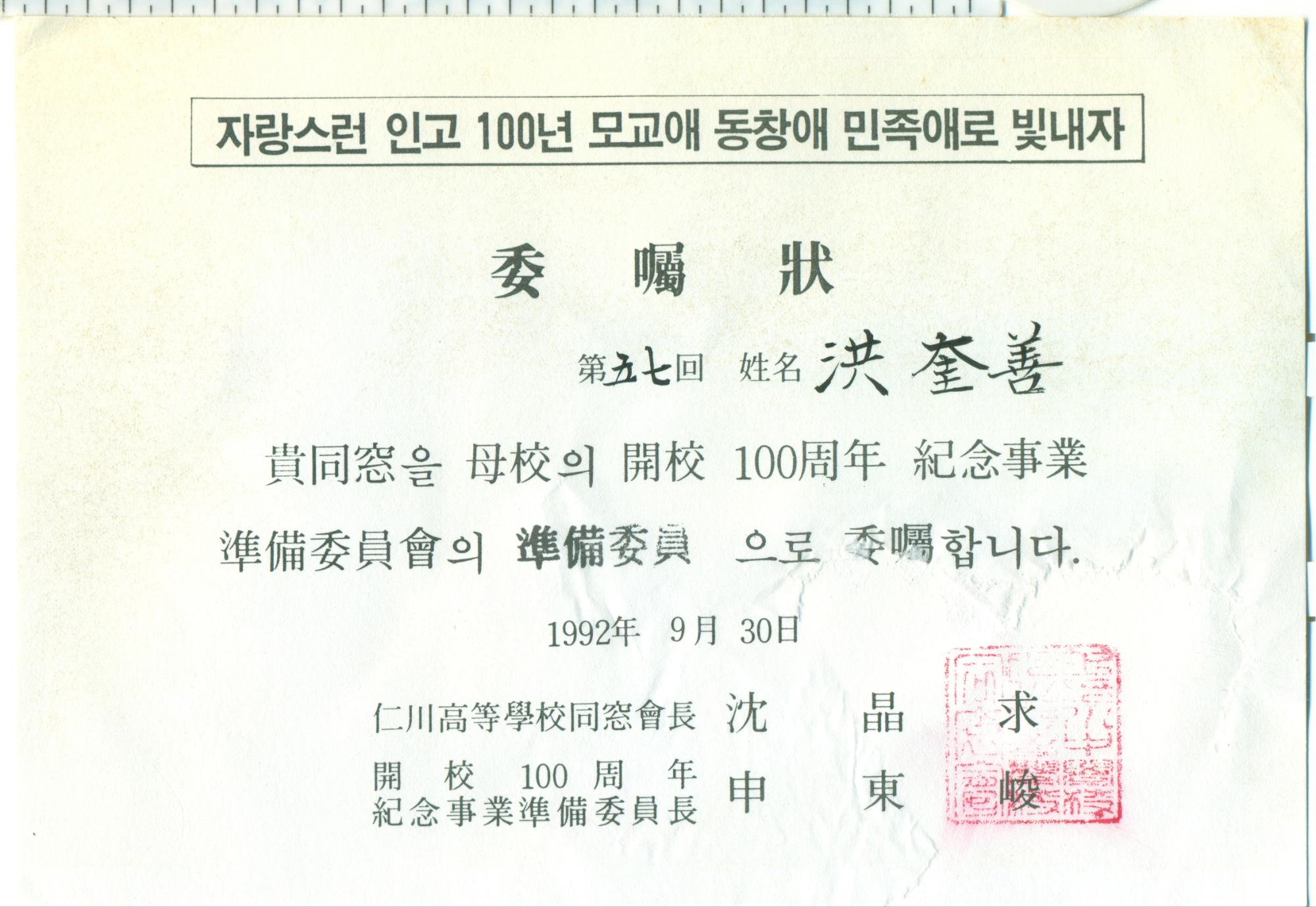 인천고등학교 개교100주년 기념사업준비위원회 준비위원 위임장 (홍규선님은 57회 졸업생)