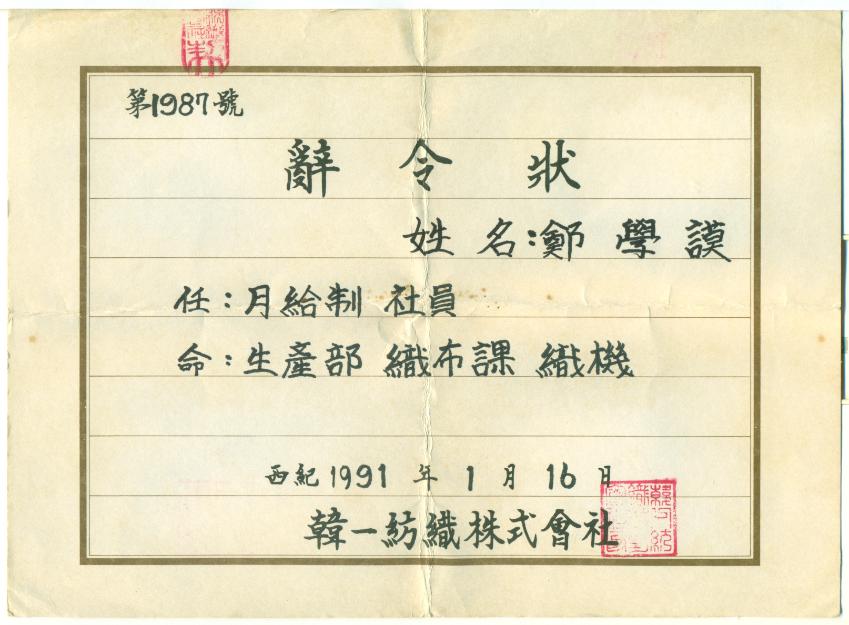 직포과 공원에서 직포과 사원으로 진급받은 사령장