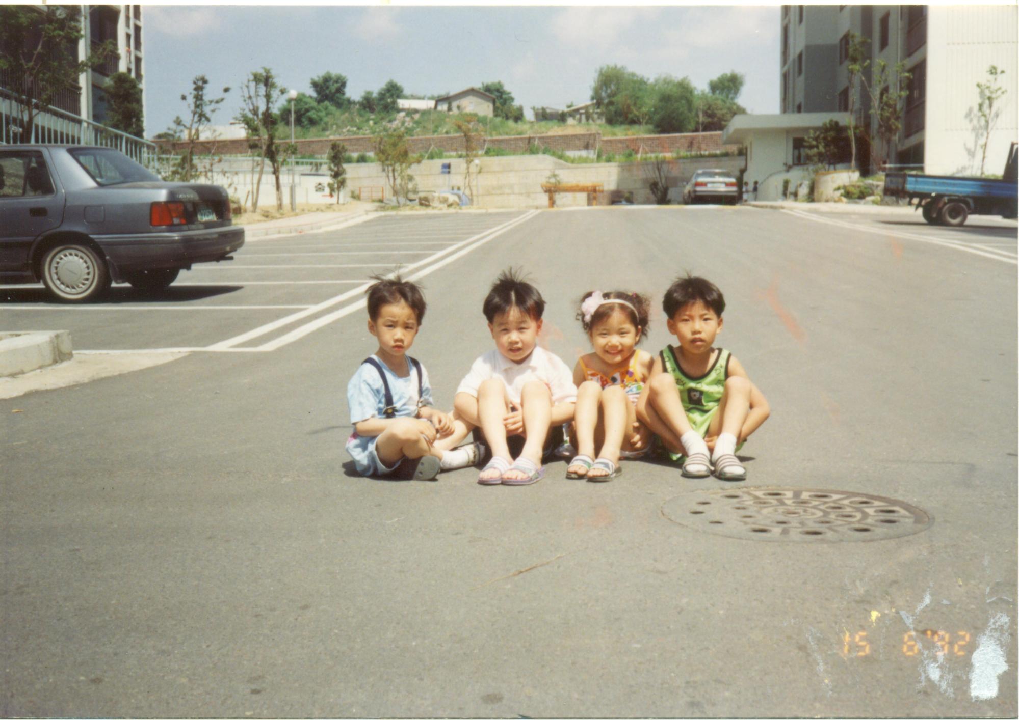 결혼 후 4년만에 분양받은 아파트 앞에서. 아들이 다녔던 홍예유치원 친구들과 함께 여름 어느 날 찍은 사진이네요. 4살 적인데 우리 아들 어린아이였을 때에도 의젓하고 멋지네요!