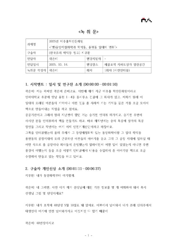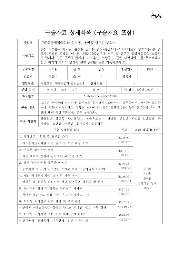 • 목 적 : 인천 미추홀구 학익동, 용현동 일대는 염전-공업지대-주거지대로의 변화하는 큰 변화가 진행된 지역임. 이 중 1960-1990년대에 거주 및 근무한 동양제철화학 노동자 및 관리자, 인근 공장의 관계자, 지역주민, 소상공인, 관련 지역사회 인물 등으로부터 인근 지역의 변화와 발전에 관한 증언을 듣고 기록하고자 함.