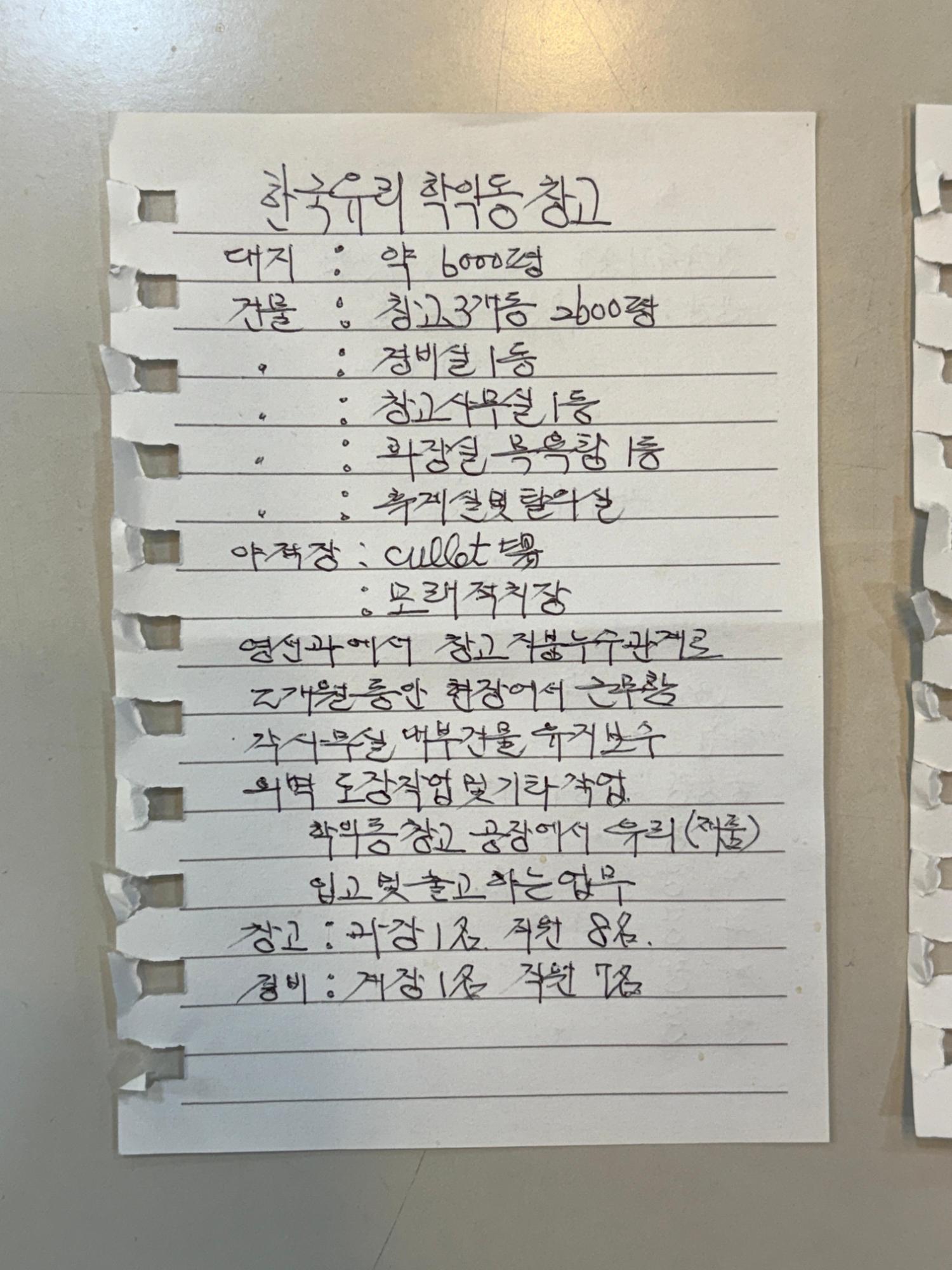 2025년 10월 14일에 진행된 면담의 면담자는 지역 기록자 곽은비이며 제물포역 지하도상가 열린공간1에서 진행되었다. 메모에는 한국유리 학익동 창고 관련 개요, 쓰임, 근무 관련한 사항이 적혀있다.