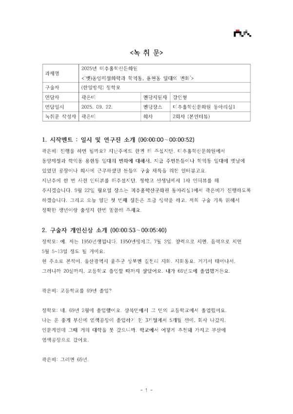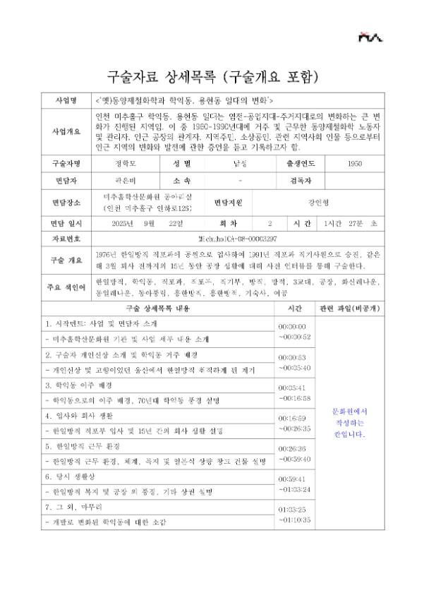 • 목    적 : 인천 미추홀구 학익동, 용현동 일대는 염전-공업지대-주거지대로의 변화하는 큰 변화가 진행된 지역임. 이 중 1960-1990년대에 거주 및 근무한 동양제철화학 노동자 및 관리자, 인근 공장의 관계자, 지역주민, 소상공인, 관련 지역사회 인물 등으로부터 인근 지역의 변화와 발전에 관한 증언을 듣고 기록하고자 함.