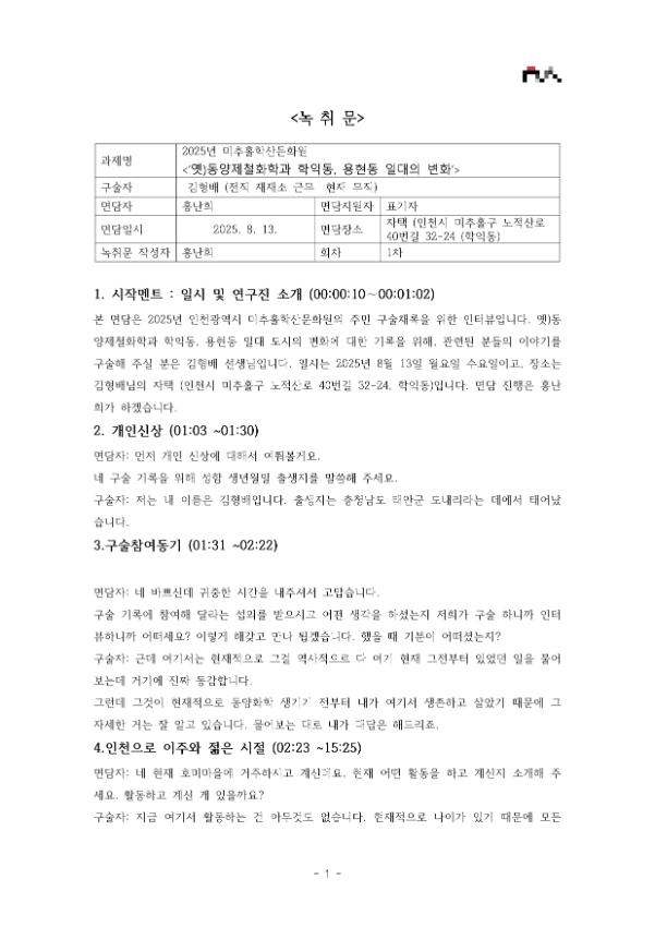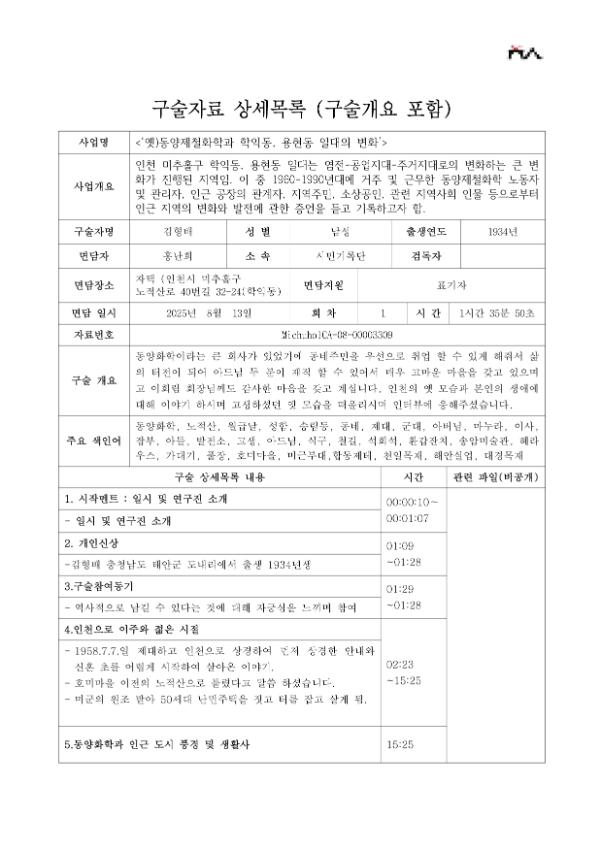 • 목    적 : 인천 미추홀구 학익동, 용현동 일대는 염전-공업지대-주거지대로의 변화하는 큰 변화가 진행된 지역임. 이 중 1960-1990년대에 거주 및 근무한 동양제철화학 노동자 및 관리자, 인근 공장의 관계자, 지역주민, 소상공인, 관련 지역사회 인물 등으로부터 인근 지역의 변화와 발전에 관한 증언을 듣고 기록하고자 함.