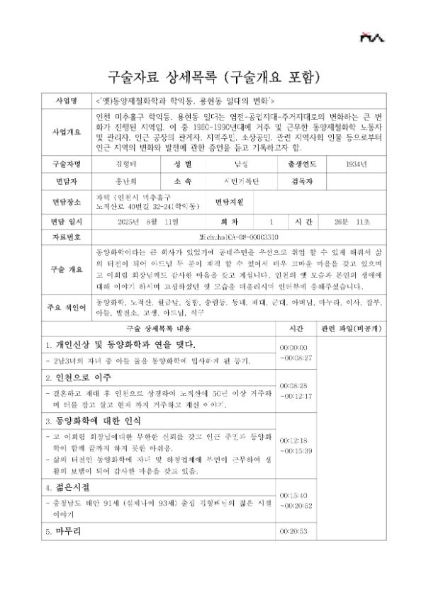 • 구술내용 요약 : 동양화학이라는 큰 회사가 있었기에 동네주민을 우선으로 취업 할 수 있게 해줘서 삶의 터전이 되어 아드님 두 분이 재직 할 수 있어서 매우 고마운 마을을 갖고 있으며 고 이회림 회장님께도 감사한 마음을 갖고 계십니다. 인천의 옛 모습과 본인의 생애에 대해 이야기 하시며 고생하셨던 옛 모습을 떠올리시며 인터뷰에 응해주셨습니다.