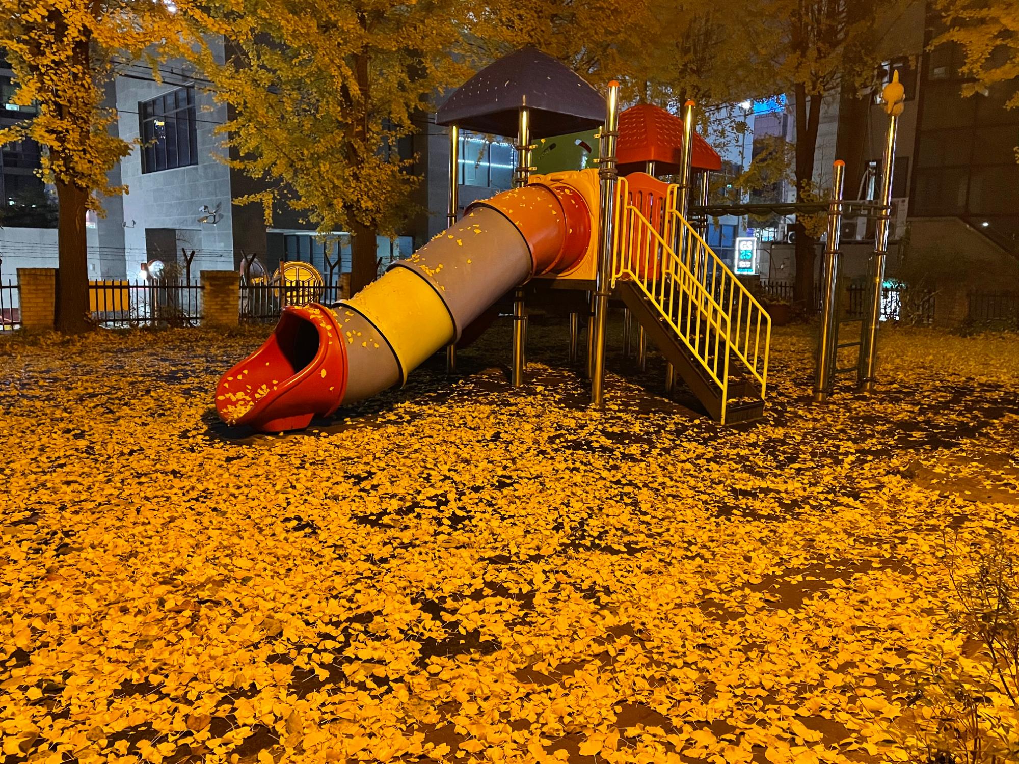 계절마다 색이 다른 오래된 아파트의 놀이터 봄에는 목련 여름엔 초록나무 가을엔 은행나무 겨울엔 하얀눈이 있는 곳늦은 퇴근길에 잠시 쉬거나!!! 집이 답답해서 숨이 쉬고 싶을때 찾는 놀터!! 내 맘이 쉬고 누군가에 대한 미움을 삭히는곳!! 아이들이 잠든 밤 열시 이후의 나만의 심상공간