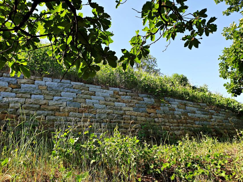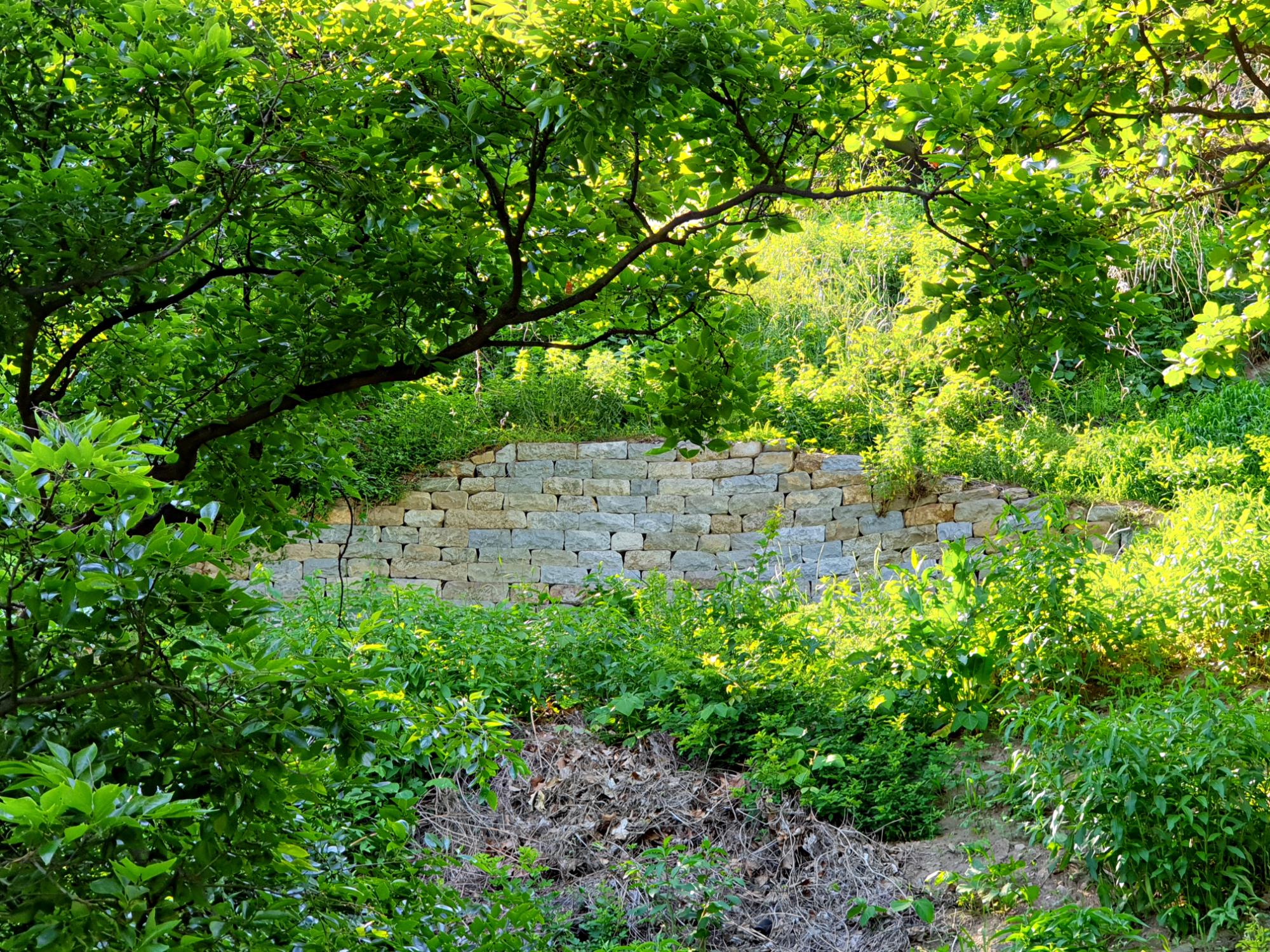 문학산 남쪽 나무다리 방향에 위치한 문학산성의 복원 모습을 촬영한 사진이다.
