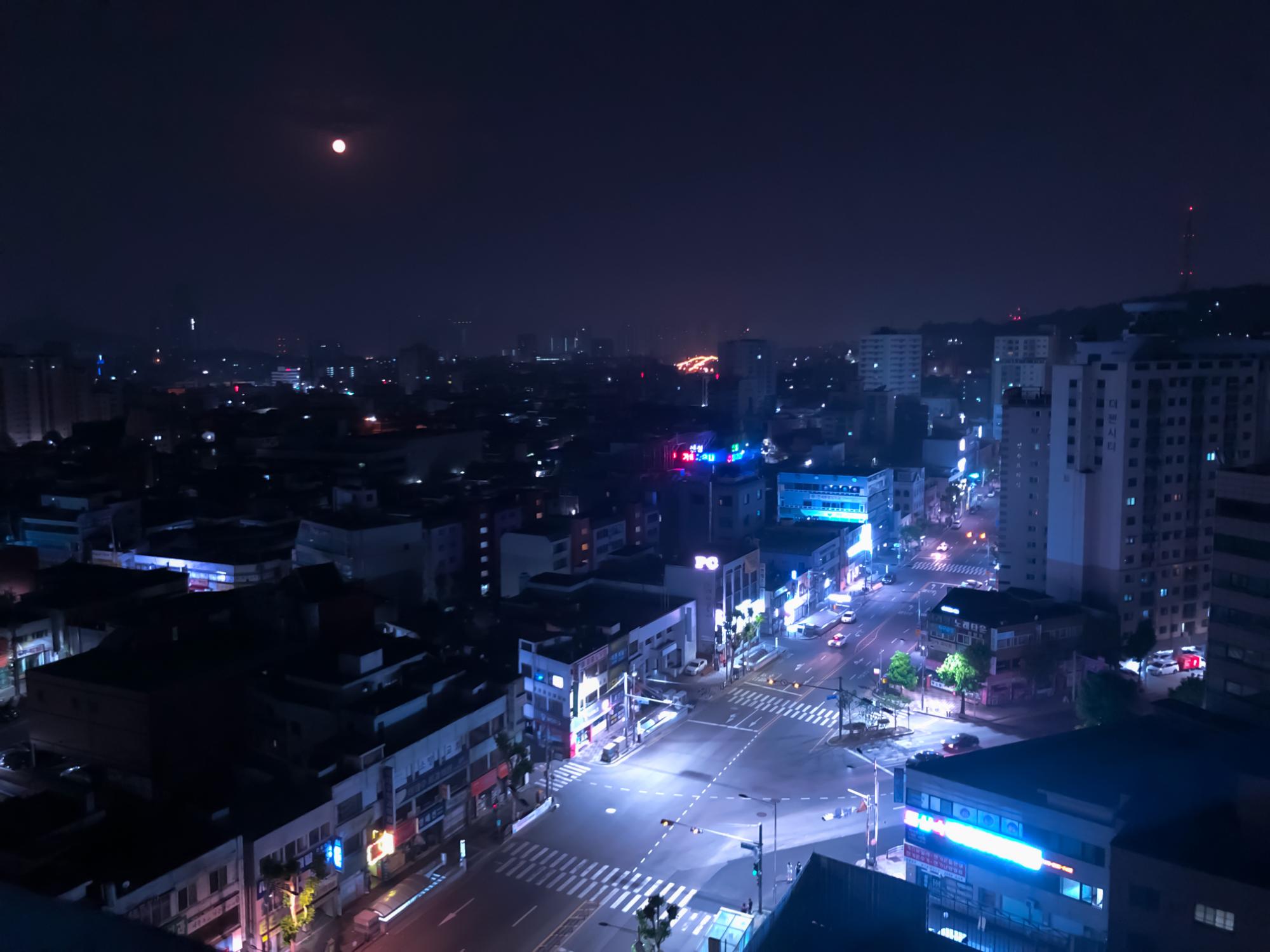 새벽 4시, 달을 보기 위해 이른 시간에 일어나 바라 본 주안사거리의 야경입니다. 도로마다 줄지어 순서를 기다리던 수많은 자동차들이 사라진 시간에 보았던 사거리는 적막하면서도 평화로웠습니다.