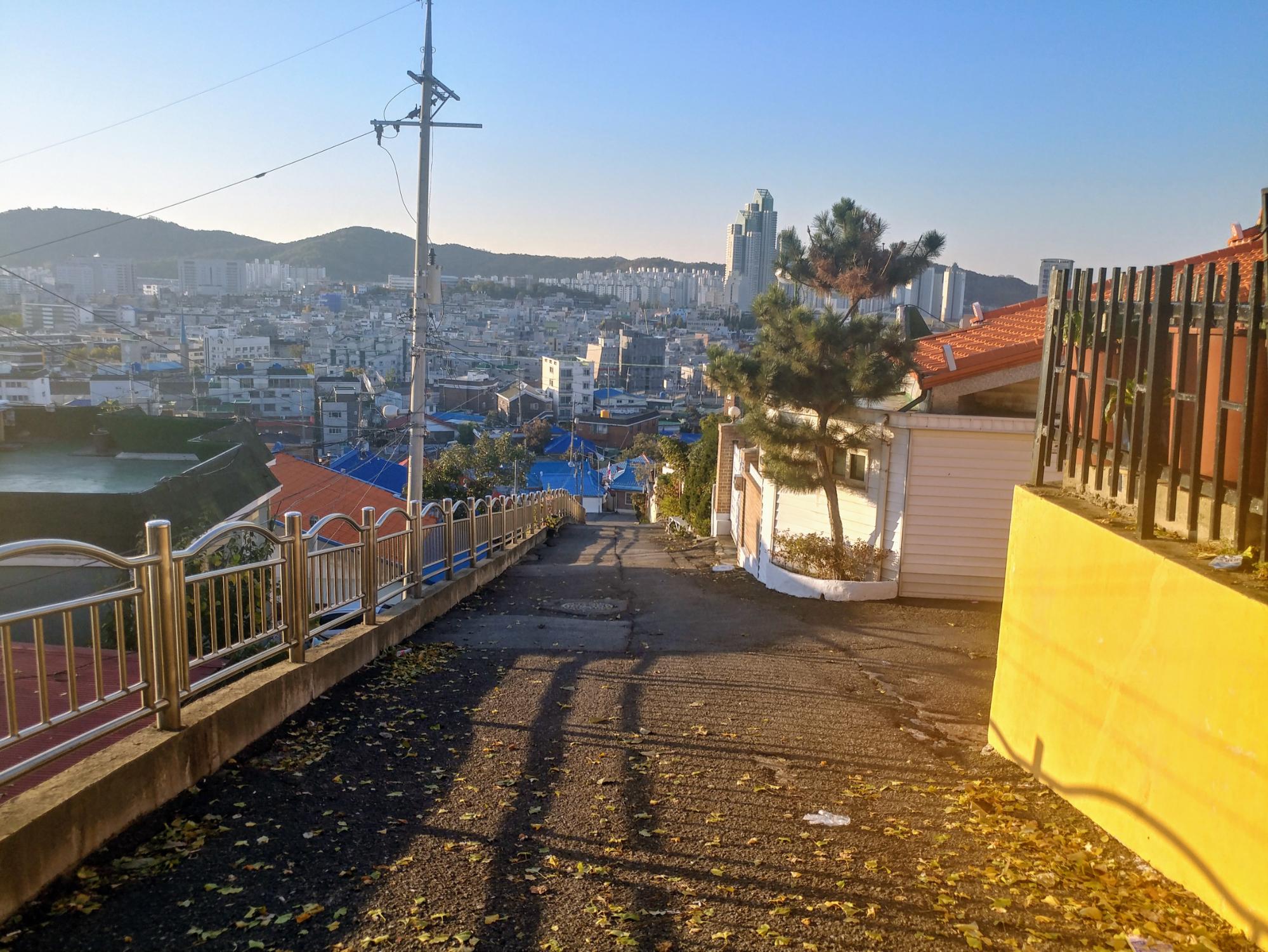 수봉공원에서 TV촬영장소인 주택가 쪽으로 내려오는 골목길,\n멀리 인하대학교가 보이고 SK 고층아파트 view가 유난히 솟아 한눈에 들어온다, 봄 여름 가을 겨울, 일출과 일몰 풍경은 먼 옛날 동심의 추억 속으로 나를 인도하기에 충분하고 시간의 흐름을 망각하게 한다, 재 계발 되지 않은 이 골목길이 이곳을 사는 사람들에게는 희노애락이 묻혀있는 추억의 시간이 멈춰버린 장소이고 엄마의 품같은 고향일 것이다.