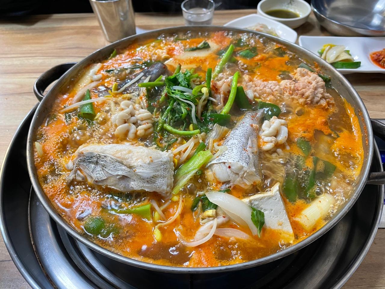 용인정 동태탕 사진인다. 잘 손질한 동태와 국내산 태양초 고춧가루로 만든 양념과 신선한 채소로 끓인 맛있는 동태탕이다. 생태전골의 인기가 많아져 자연스럽게 생선찌개도 함께 하기시작했다.
