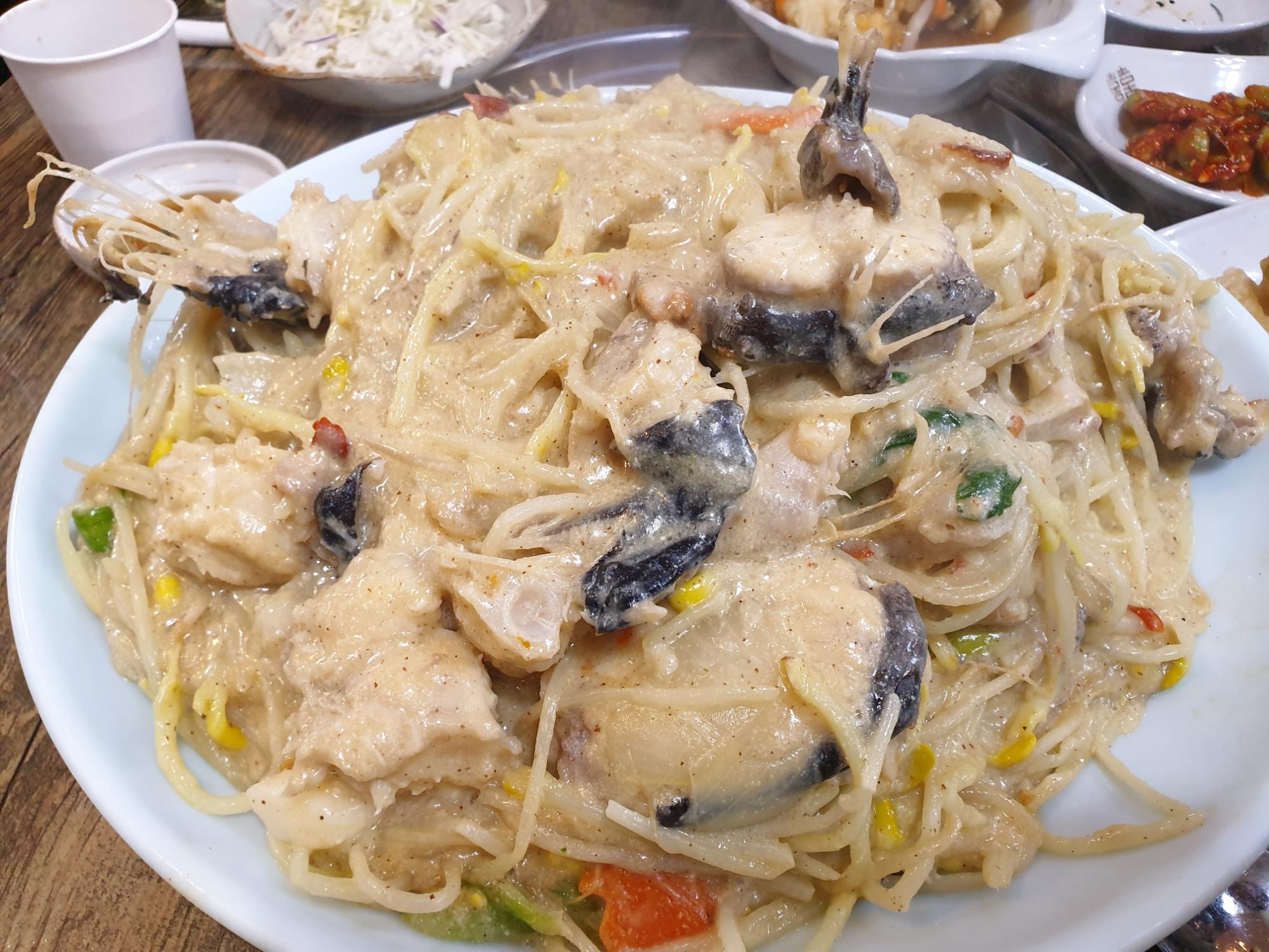 본가물텀벙 들깨아구찜 사진이다. 새로운 음식을 만들기위해 사장님이 오랫동안 연구, 개발하여 만든 들깨아구찜이다. 들깨는 느끼할 수 있는데 사장님의 연구끝에 느끼하지 않고 모든연령의 손님들이 좋아하는 음식을 개발하였다.