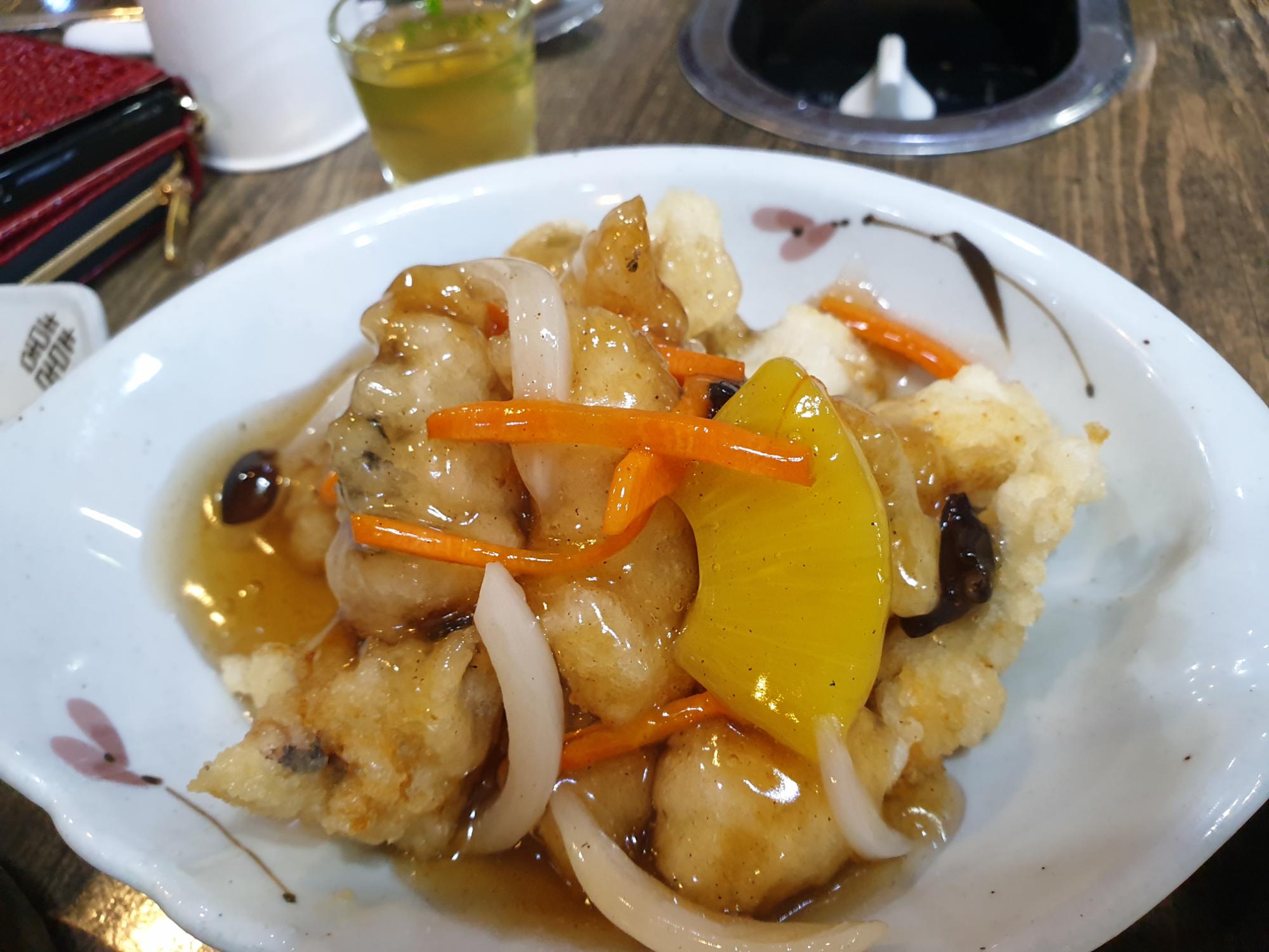 본가물텀벙 아구탕수육 사진이다. 아구살을 이용해 만든 아구탕수는 남녀노소 누구나 즐길 수 있는 음식이다. 사장님이 연구하여 만든 아구탕수는 인기가 좋은 메뉴중 하나이다.