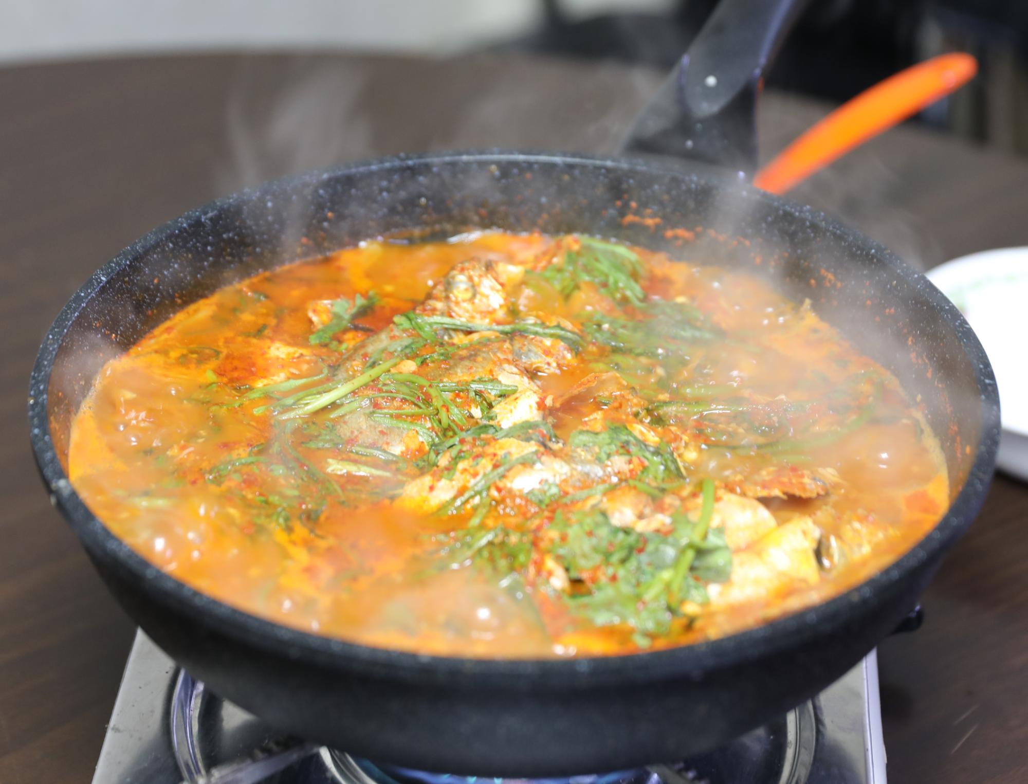 홍어전문점 조기탕 사진이다. 조기탕은 조선된장, 멸치액젓, 마늘, 소금을 사용하여 만든다. 재료가 많이 들어가지 않지만, 조기에서 단맛이나오고 무랑 쑥갓으로 더해 향과 맛을 조금 더 높일 수 있다.