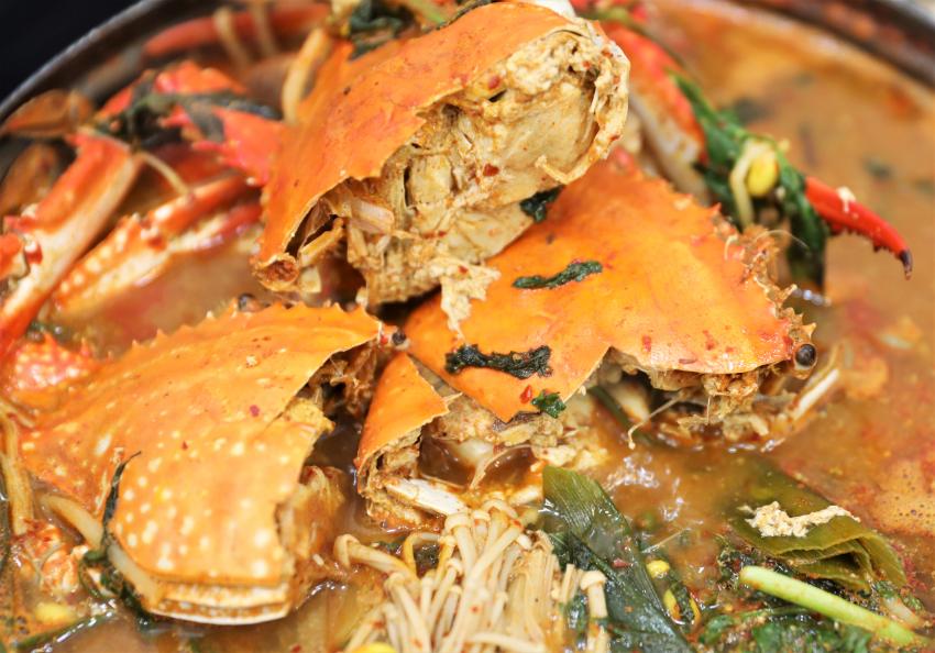 제철홍어무침꽃게장 꽃게탕사진이다. 신선한 꽃게를 손질하여 비법 소스를 넣어 만든 꽃게탕이다. 시원하고 칼칼한 국물과 각종 신선한 야채가 들어가 더욱 더 맛있는 꽃게탕을 손님들에게 제공하고 있다.