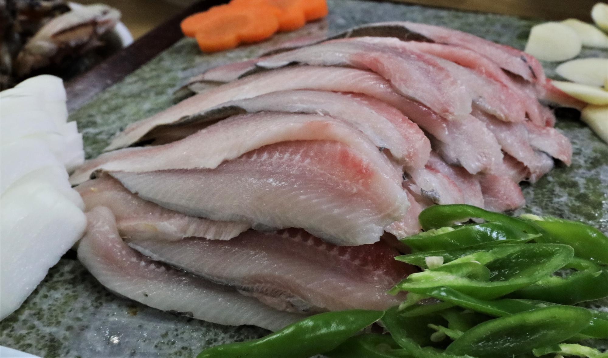 금산식당 밴댕이회 사진이다. 밴댕이는 뼈까지 회로 먹는 생선이며, 한마리를 통채로 먹고 깊은맛이 나는 독특한 생선회이다. 밴댕이를 회로 먹기 위해서 신선도 유지를 우선적으로 하고 있다.