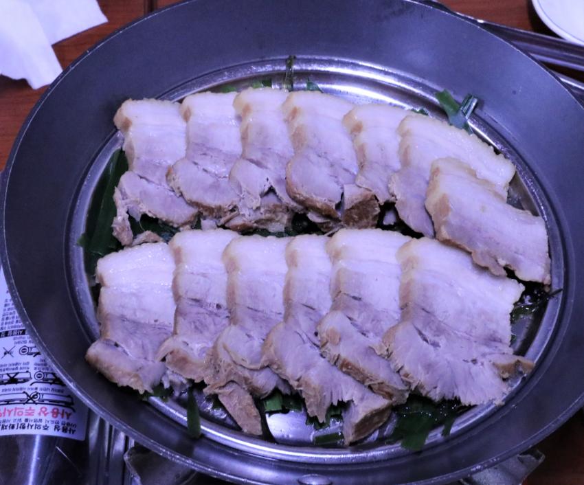 흑산도 홍탁 홍어삼합 사진이다. 흑산도 홍어를 직접 구매해 손질하고 삭혀서 홍어를 만들며, 더불어 수육은 몇시간동안 직접 매일 끓인다. 홍어와 함께 수육, 김치로 구성된 삽합은 손님들에게 제공한다.