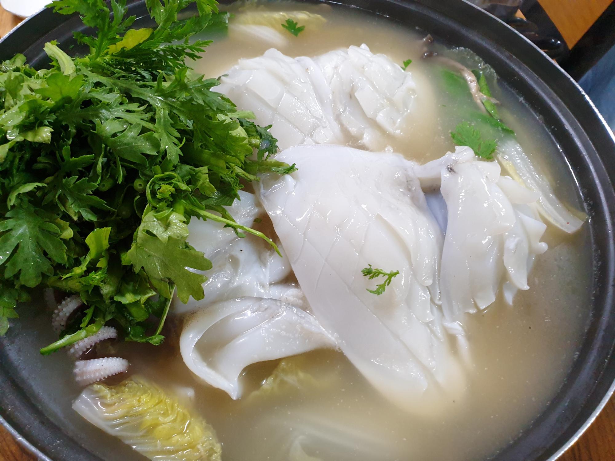 엄지식당 갑오징어 샤브샤브 사진이다. 갑오징어 샤브샤브는 맑은 육수에 각종채소와 신선한 갑오징어를 넣어 만든다. 갑오징어 샤브샤브는 시원하고 개운한 맛이며, 어른들이 자주 찾는 메뉴이다.