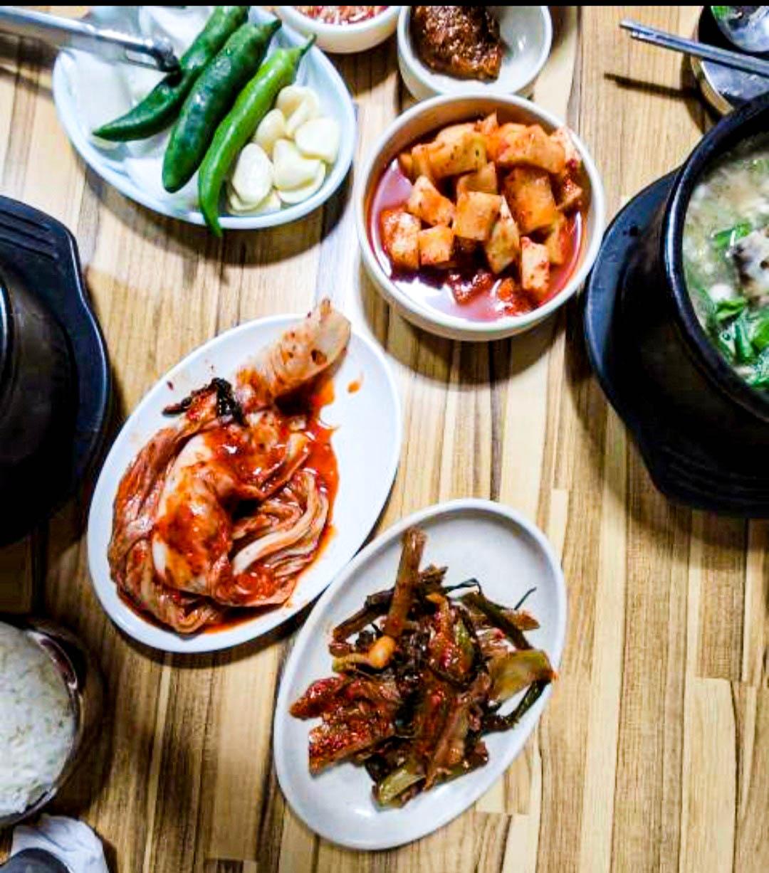 언니네 순대국 반찬사진이다. 순대국과 함께 제공되는 반찬이다. 마늘과 고추, 김치3종류가 제공된다. 김치는 배추김치, 깍두기, 갓김치가 나온다. 다른곳과 다르게 갓김치가 나오는데 사철내내 사용할 수 있도록 보관하여 사철내내 제공하고 있다.