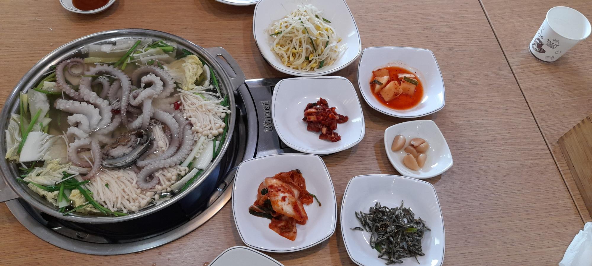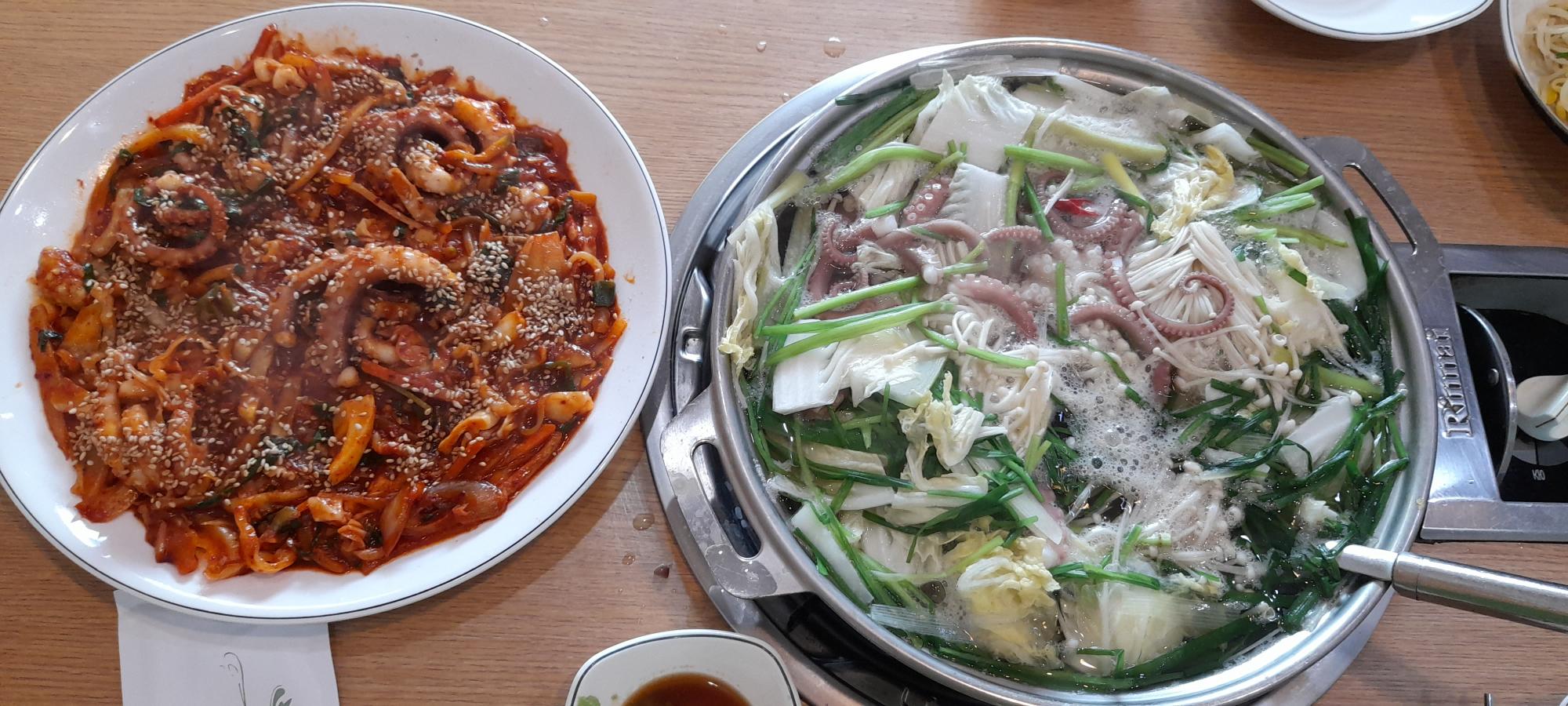 낙지마당 낙지볶음, 연포탕 사진이다. 덕적도, 연평도 근처에서 낙지를 잡아 손질하여 음식을 만든다. 신선한 낙지여서 손질하는데 오래 걸리지 않는다. 조미료를 거의 사용하지 않아 깔끔한 맛의 연포탕과 낙지볶음 맛을 느낄 수 있다.