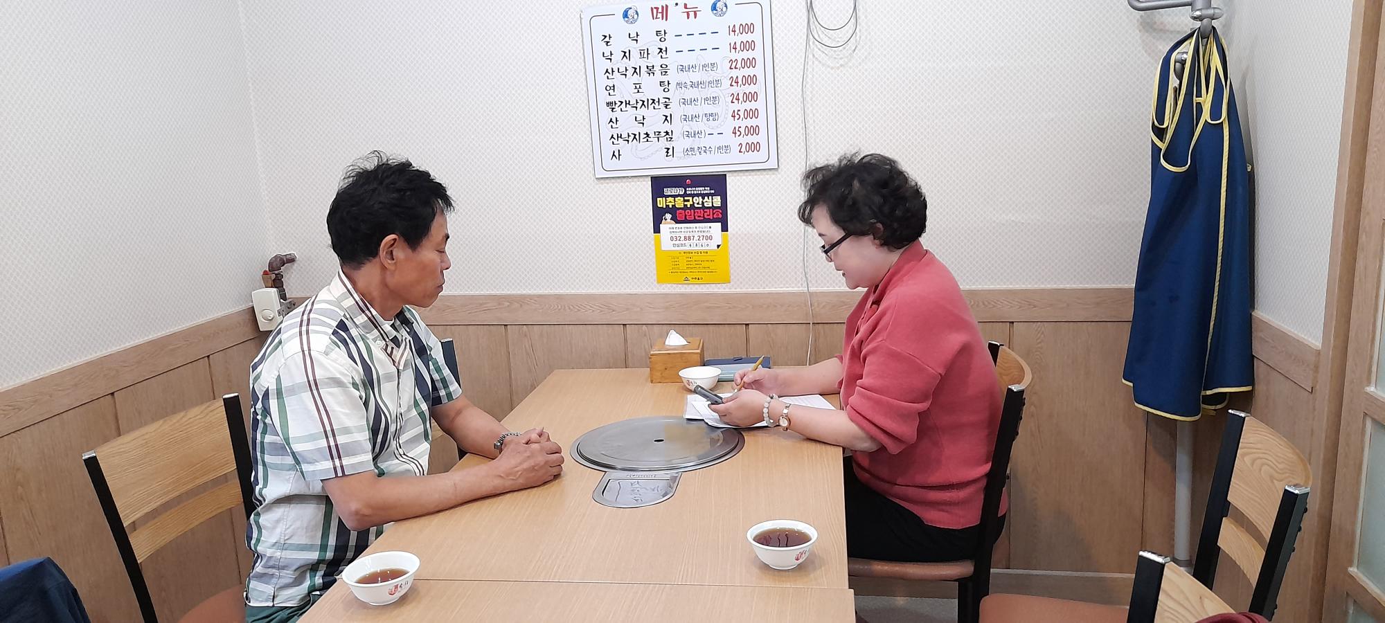 낙지마당 사장님 인터뷰사진이다. 미추홀구에 온지 22년이 되었으며, 낙지마당을 운영한지 14년째이다. 종종 구입한 배를 타고 낙지를 잡기도 하며, 현재 14년째 같은곳에서 가게를 운영중이다. 좋은재료와 변함없는 맛이 제일 중요하다고 생각한다.