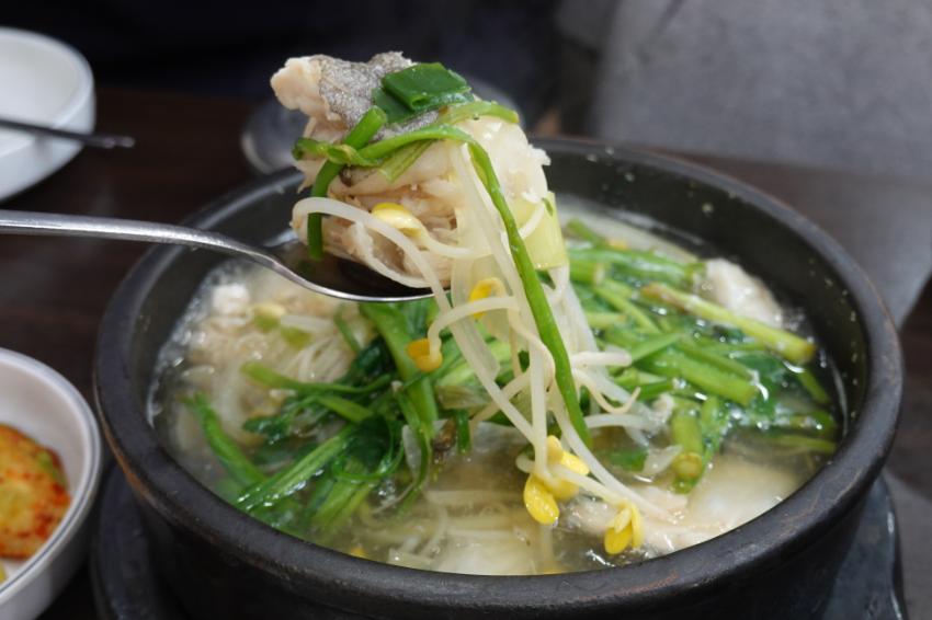김가네볼테기아구찜의 볼테기탕 사진이다. 맑은 육수의 볼테기탕은 채수로 만든 육수를 이용하여 만든다. 시원하고 깔끔한 맛이며, 볼테기를 즐겨찾는 어른들에게는 인기가 많은 메뉴이다.