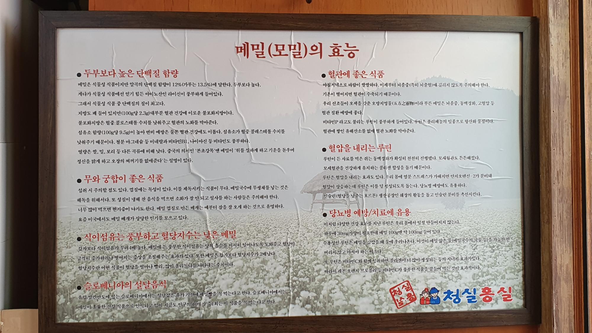 청실홍실 메밀의 효능사진이다. 액자속에는 메밀의 효능이 적혀있다.
