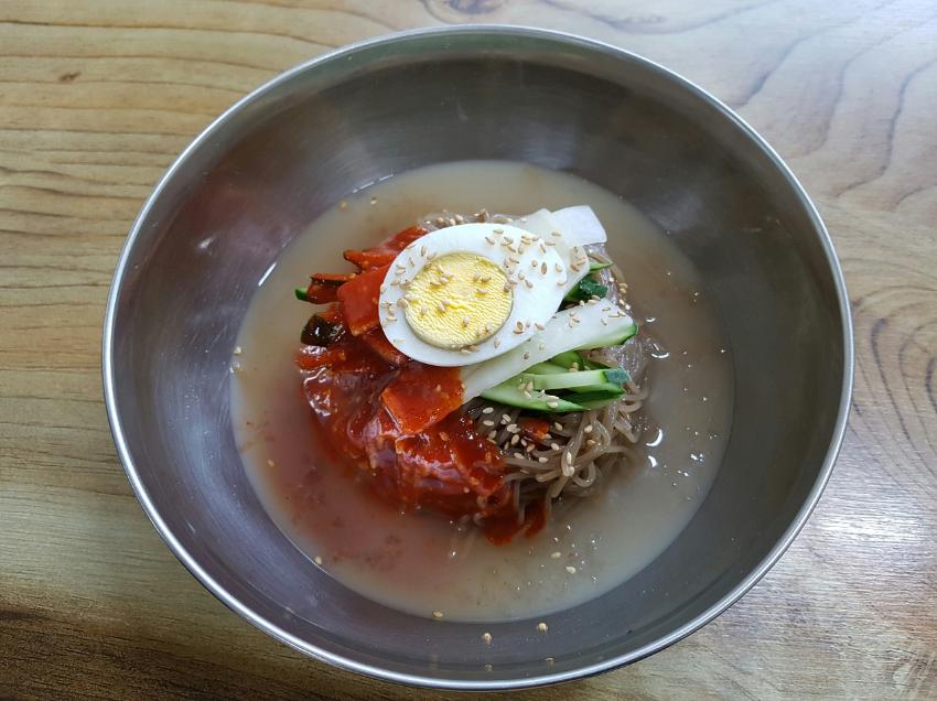 백령도냉면 반냉면 사진이다. 비빔냉면의 냉면육수를 넣은 반냉면은 손님들에게 인기가 많은 메뉴 중 하나이다.
