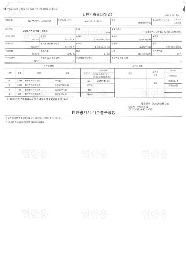 본 건물의 처음 등록시 용현4동사무소로 등록되었기 때문에, 서류의 건축물 명칭이 용현4동 주민센터로 되어있다.