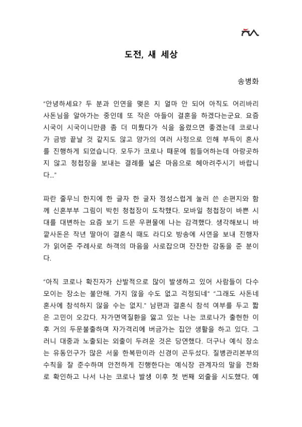 이 수필은 제1회 학산백일장 '미추홀, 안부를 묻다'에서 코로나로 변화된 일상과 그 속의 안부라는 주제로 쓴 송병화의 '도전, 새 세상' 이며, 일반부 부문 동상을 수상한 작품이다.