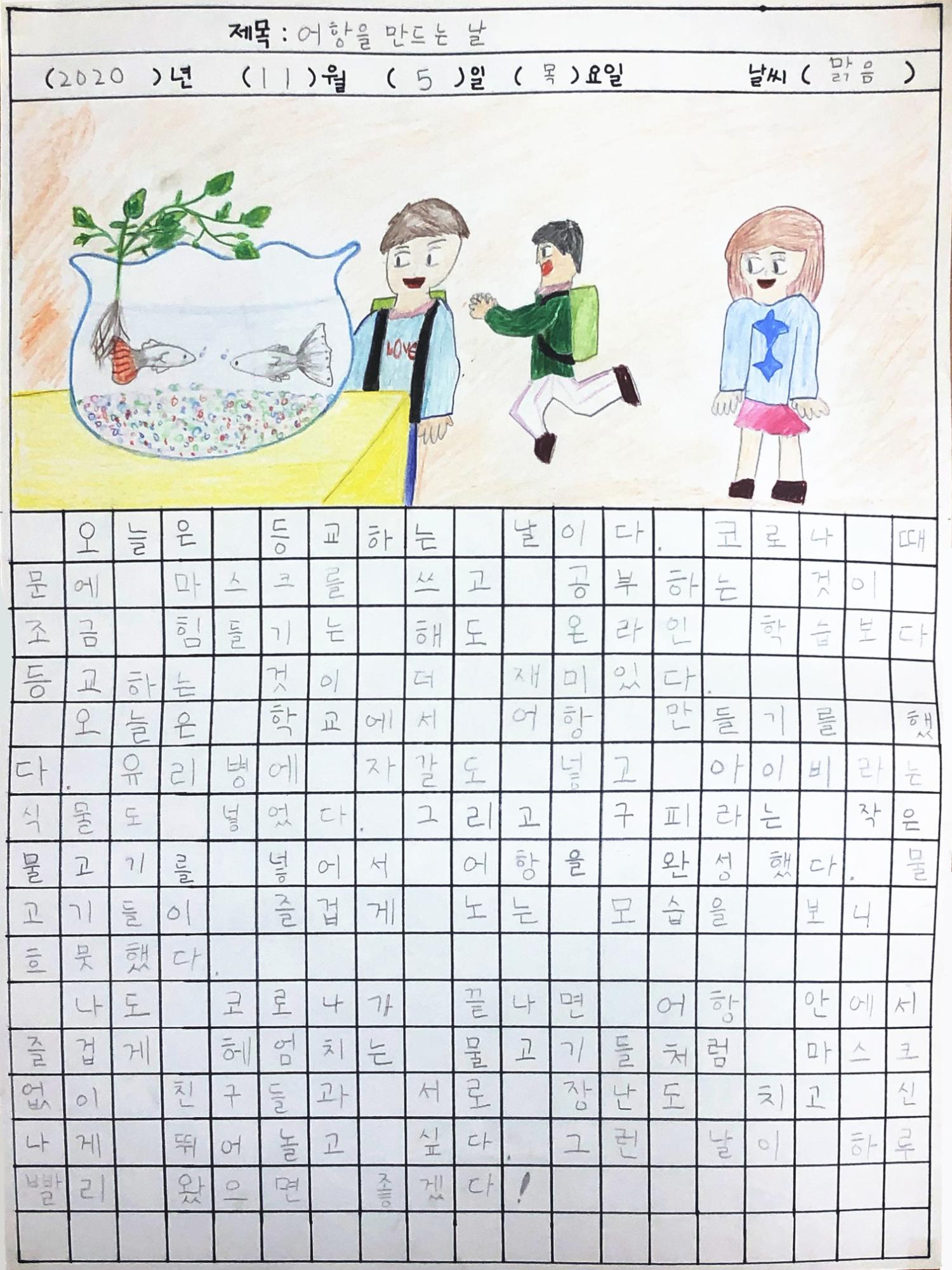 이 그림일기는 제1회 학산백일장 '미추홀, 안부를 묻다'에서 코로나로 변화된 일상과 그 속의 안부라는 주제로 쓴 송시우의 '어항을 만드는 날' 이며, 초등부 부문 동상을 수상한 작품이다.