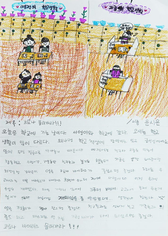 코로나로 예전과 같이 학교에서 친구들과 수다떨지 못하는 등 놀지 못해 코로나가 빨리 끝나길 바라는 내용과 코로나 전과 후 학교생활을 그림으로 그렸다.