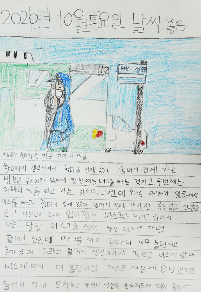 이 그림일기는 제1회 학산백일장 '미추홀, 안부를 묻다'에서 코로나로 변화된 일상과 그 속의 안부라는 주제로 쓴 김건우의 '할머니 집 가는 길이 바뀐 날' 이며, 초등부 부문 은상을 수상한 작품이다.