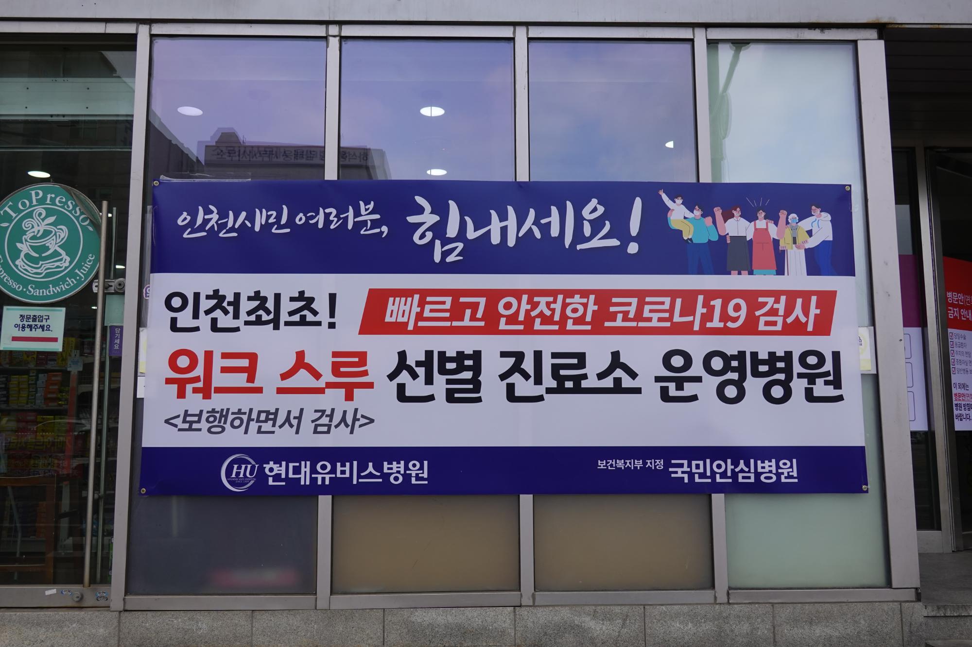 코로나19 감염증 확산으로 지역의 병원 및 공터(역 앞 및 공원)에는 코로나19 검사를 할 수 있는 선별진료소가 설치되었다. 현대유비스병원 선별진료소에는 보행하면서 검사를 할 수 있는 워크 스루 방식의 진료소를 이용할 수 있다고 표기된 모습이다.