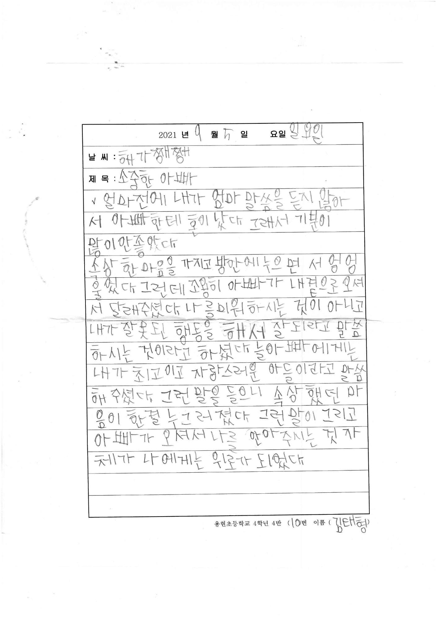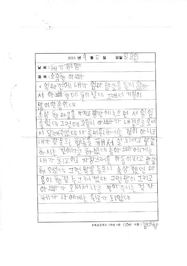 이 그림은 제2회 학산백일장 '미추홀, 삶을 위로하다'에서 내게 위로가 되는 것들이라는 주제로 그린 김태형의 '소중한 아빠' 그림일기이며, 초등부 부문 동상을 수상한 작품이다.