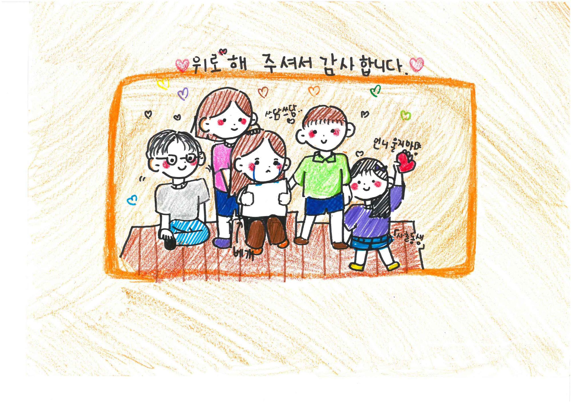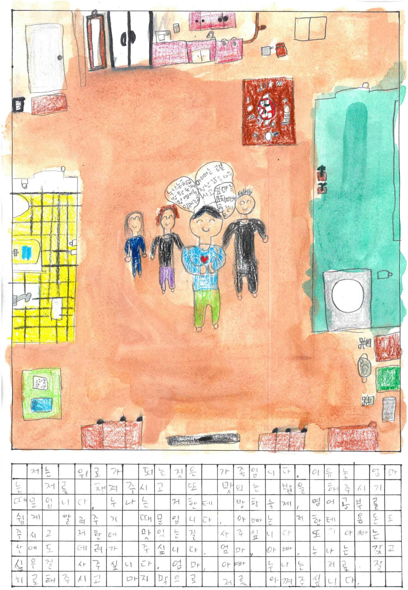 위로가 되는 것은 가족이며 각각의 이유와 함께 갖고 싶은 걸 사주고 위로해주며 아껴주신다고 적었다. 그림은 집에 있는 본인과 가족을 그렸다.