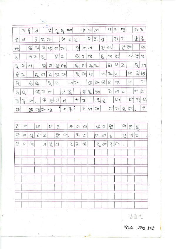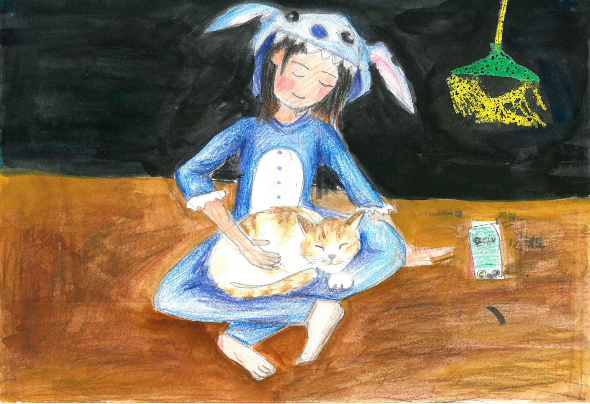 가끔 집에 갇혀있는 애완묘(이름: 치즈)가 불쌍해 풀어주면 기분이 안좋은걸 아는지 주변을 빙빙돌며 위로해 주는 모습을 적었다. 그림은 고양이를 무릎위에 앉혀서 만지고 있는 모습을 그렸다.