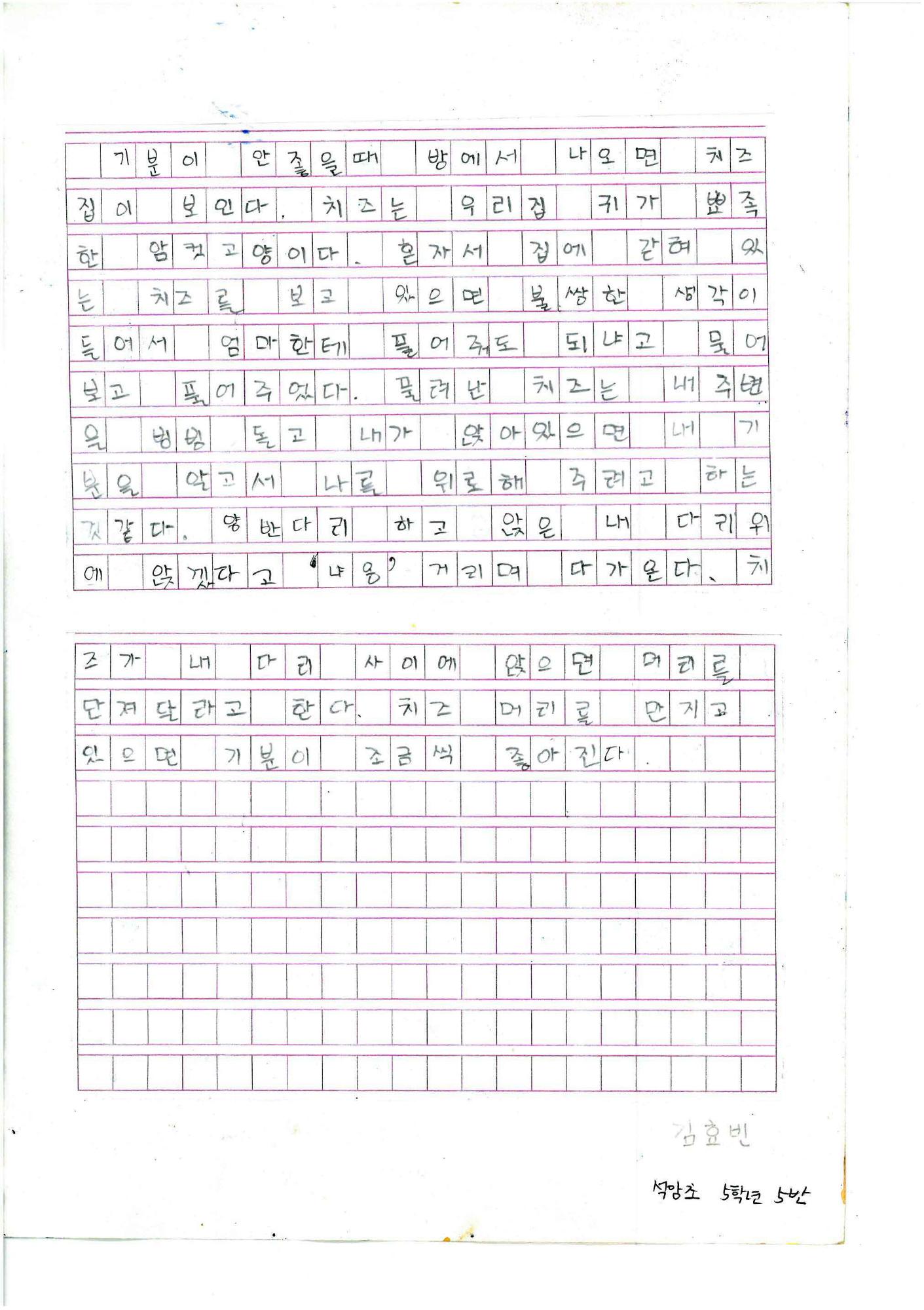 이 그림은 제2회 학산백일장 '미추홀, 삶을 위로하다'에서 내게 위로가 되는 것들이라는 주제로 그린 김효빈 그림일기이며, 초등부 부문 은상을 수상한 작품이다.