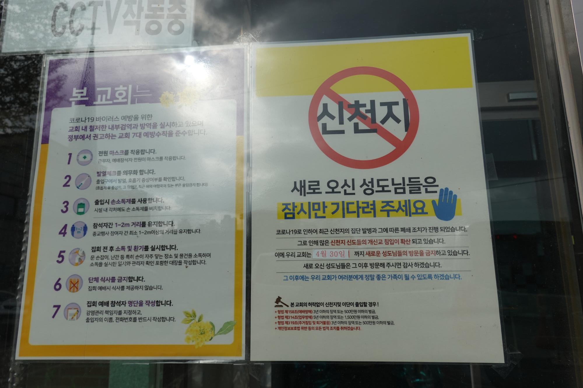 샘물교회 정문 앞에 붙어있는 신천지 방문금지 안내문과 코로나19 바이러스 예방을 위한 방역수칙이 붙어있다.  코로나19 확산 초기 신천지 내 발병이 확산된 상황에서 신천지의 개신교 침입이 확산되고 있어, 교회의 정문에 관련 안내문이 붙어있음을 확인할 수 있다. 그리고 정부에서 권고하는 교회시설의 7대 예방수칙을 준수함을 안내하고 있다.