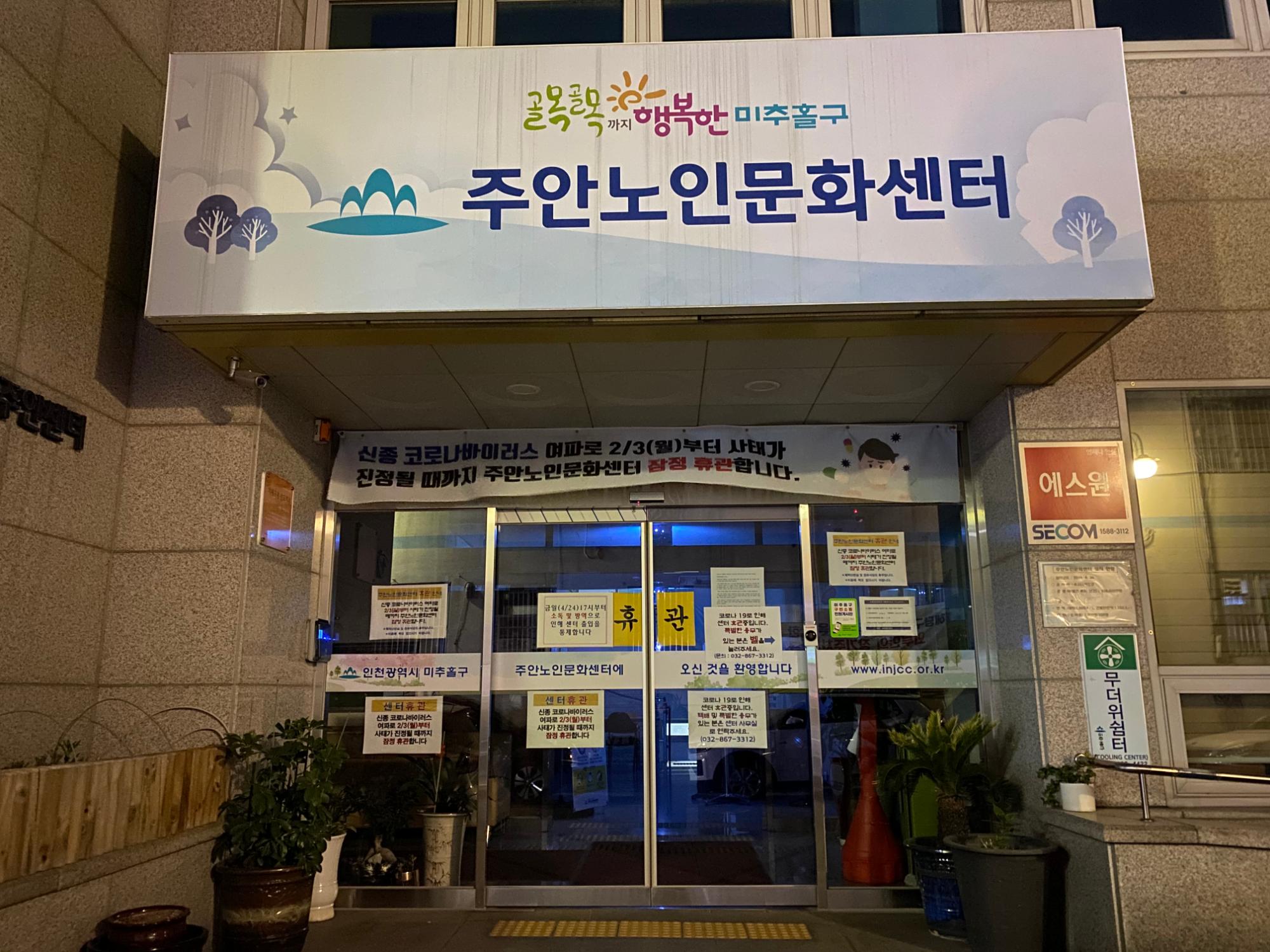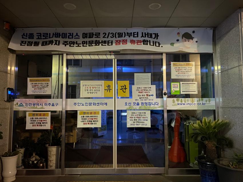 주안노인문화센터 정문에 붙은 코로나 안내문 및 현수막이다. 2월3일부터 코로나바이러스의 여파로 해당 노인문화센터 운영이 잠정 휴관된 상태임을 알 수 있다.