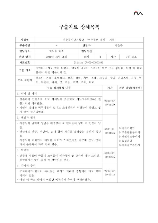 • 구술내용 요약 : 지인의 소개로 먹게 되었음, 만두에 국물이 스며들어 먹는 맛을 좋아함, 어릴 때 학교 앞에서 먹던 떡볶이의 맛.